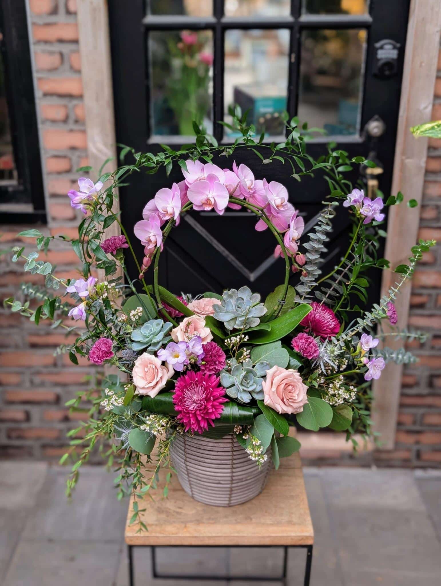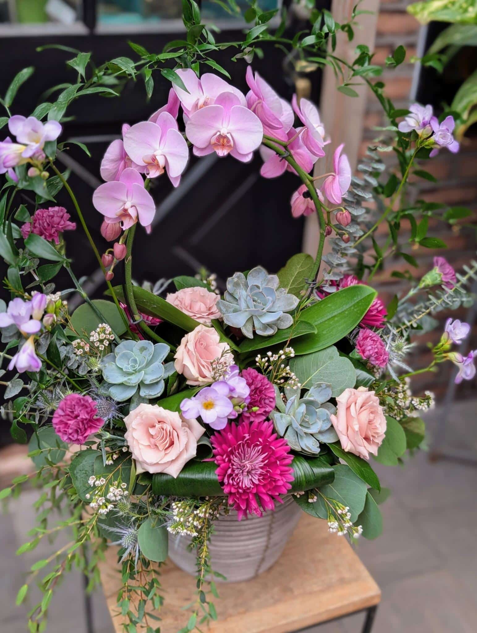 - This stunning arrangement has light purple orchids arching over a bed of succulents, roses, chrysanthemums, and freesia, surrounded by a nest of wild greens