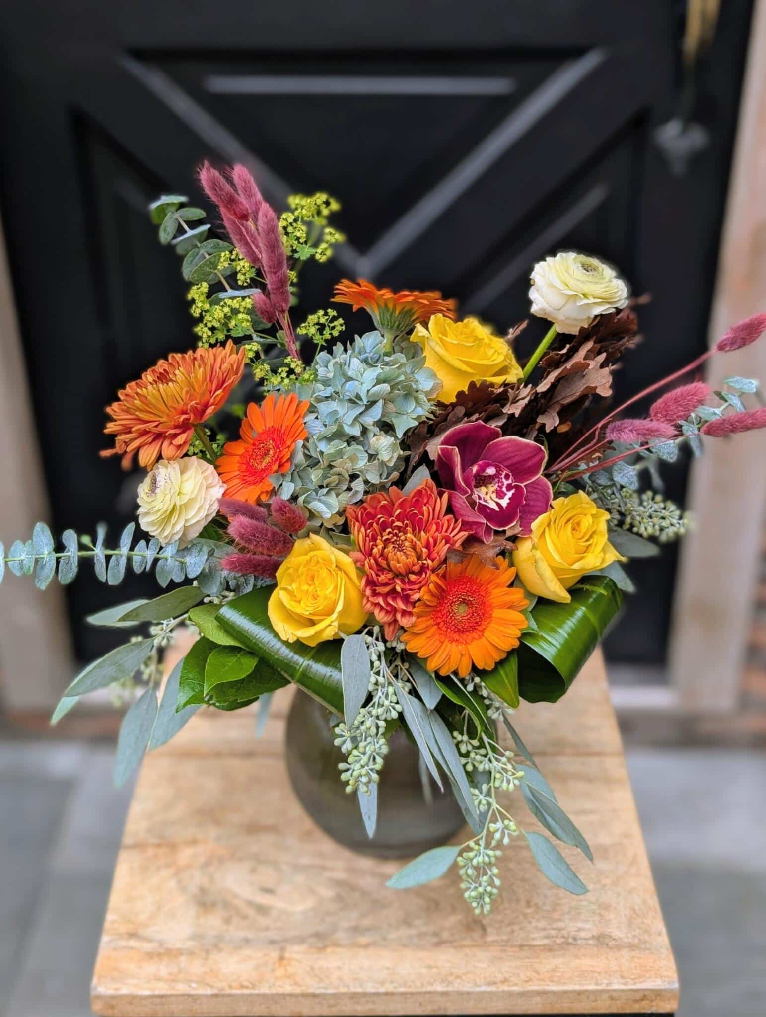 - Features locally grown Niagara gerbera daisies and ranunculus