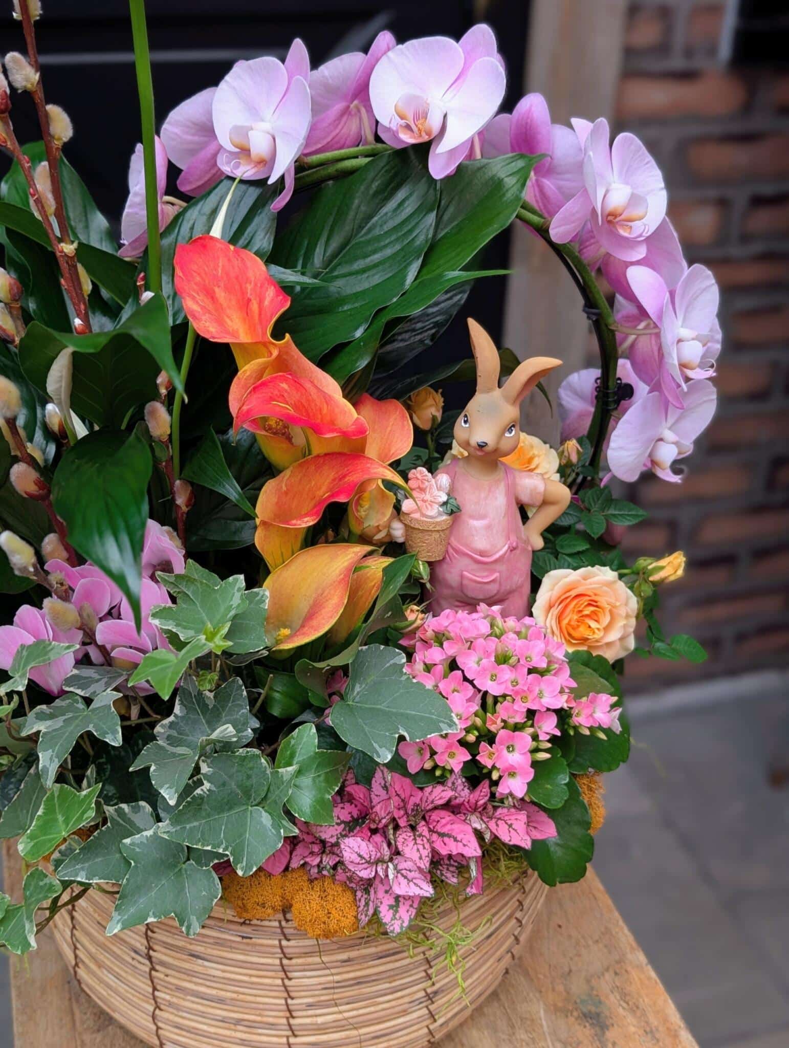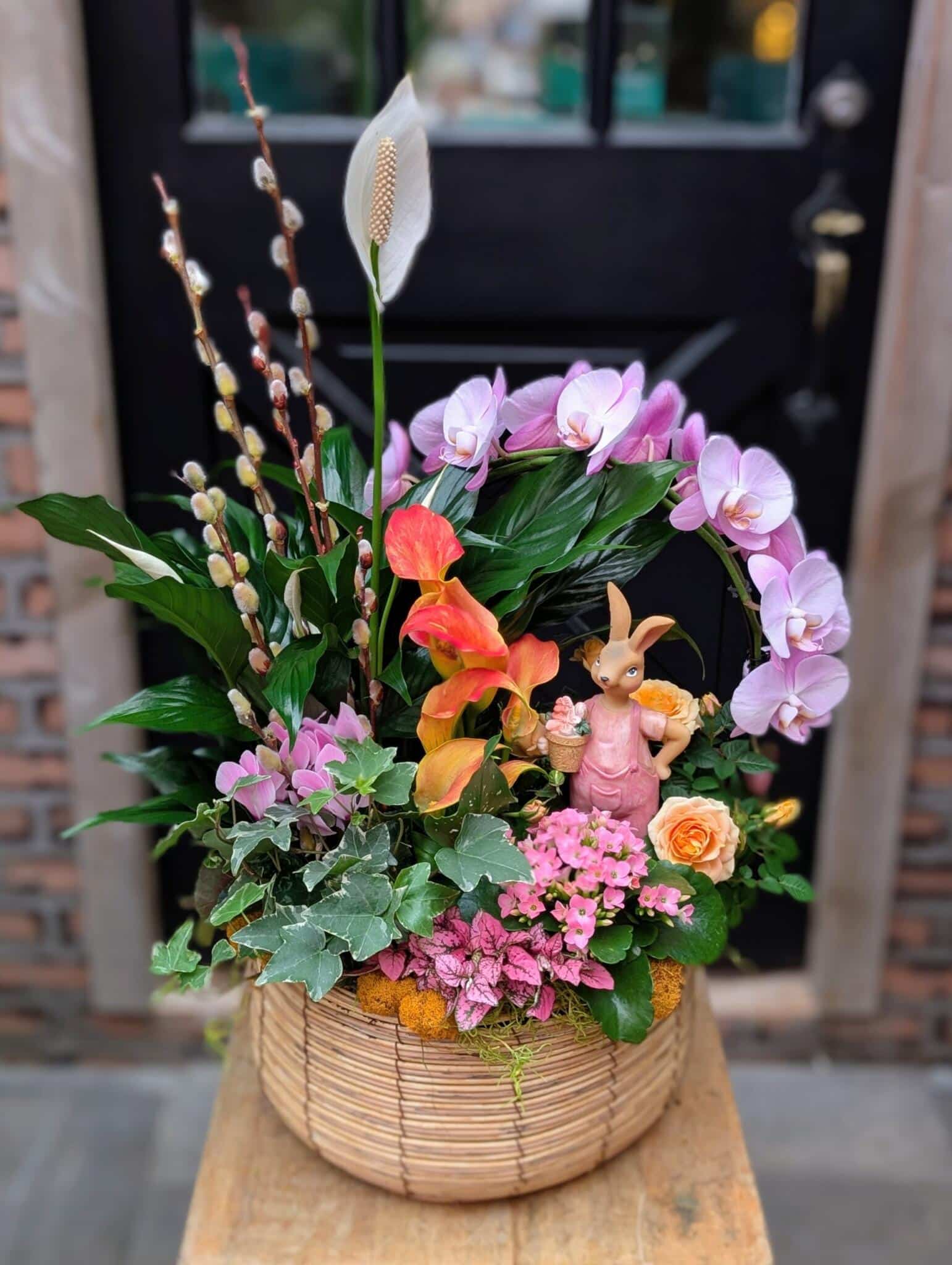 A cheerful planter featuring graceful orchids, vibrant calla lilies, soft blooming plants and lush greenery, gathered around a sweet bunny accent and finished with natural pussy willow branches.