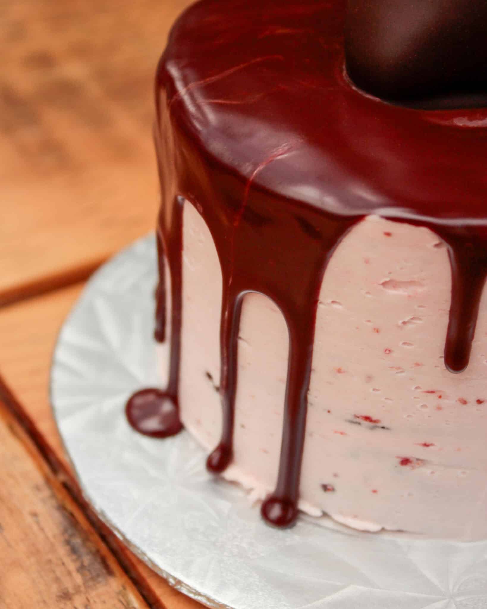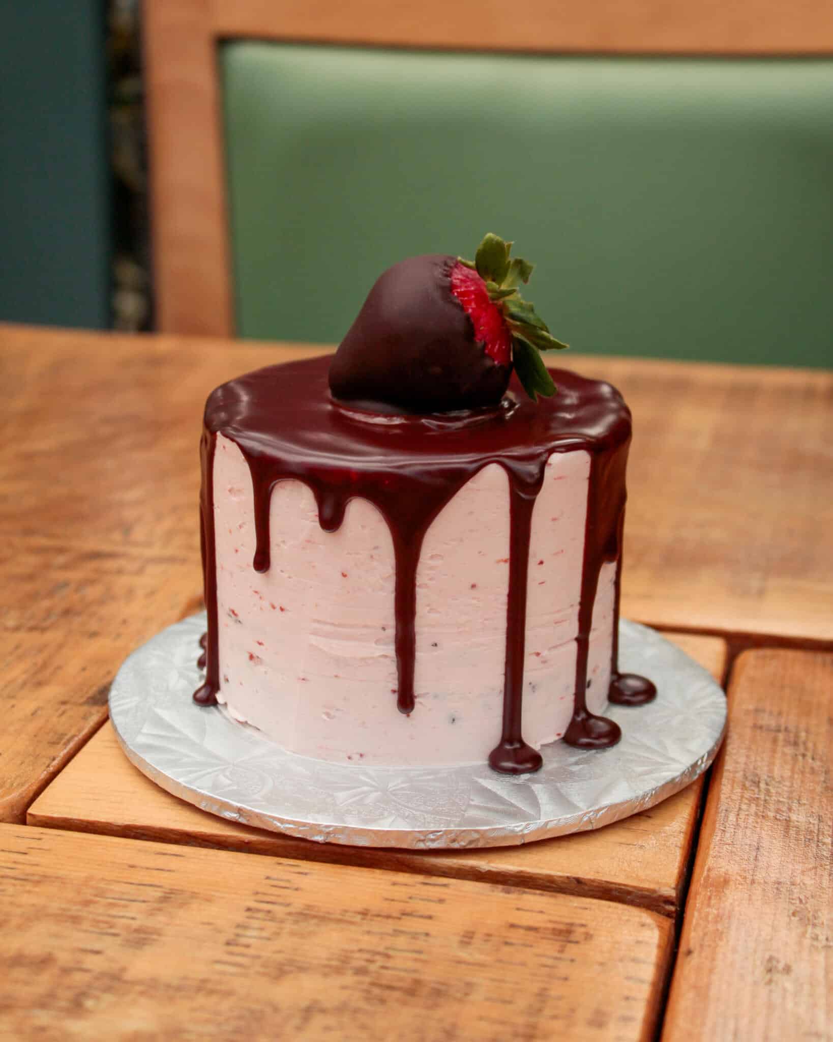 Our super moist chocolate cake layered with strawberry Swiss meringue buttercream and topped with ganache and a chocolate dipped strawberry.