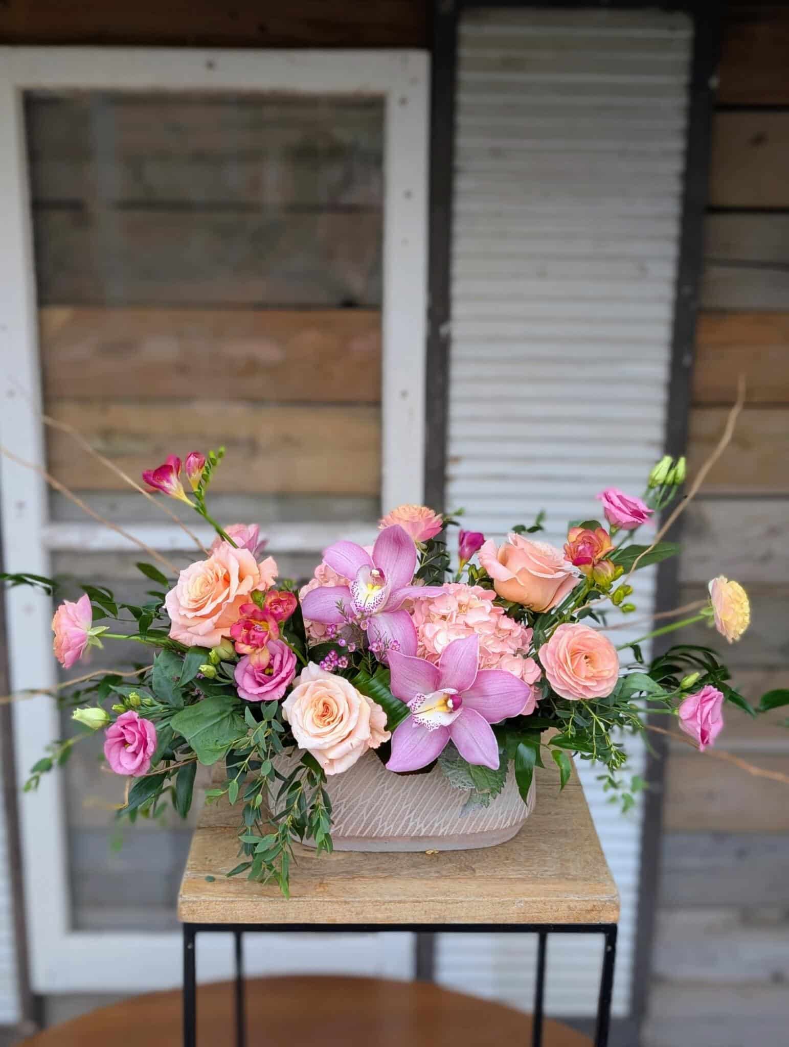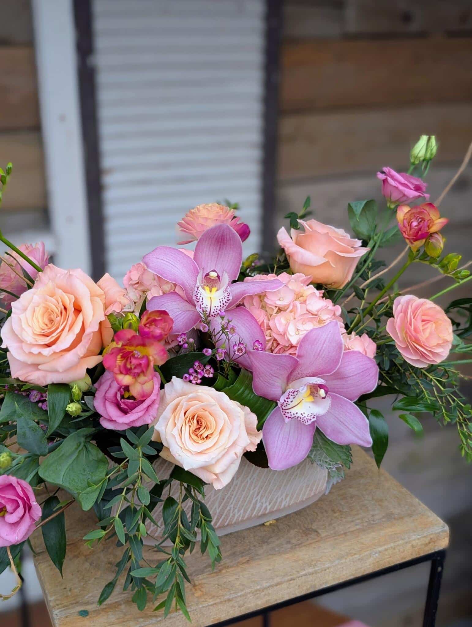 - features locally grown ranunculus, freesia, lisianthus, and orchids