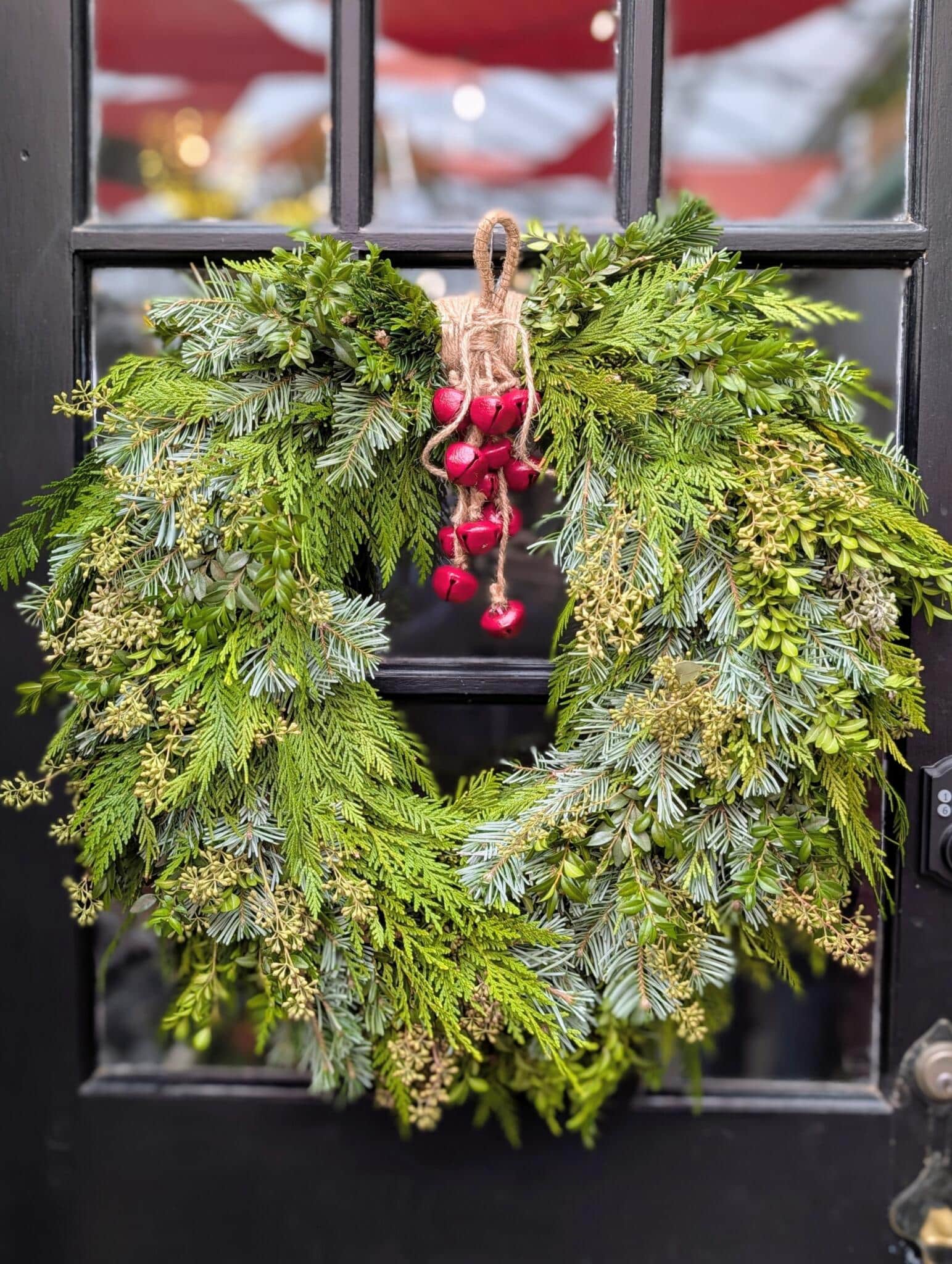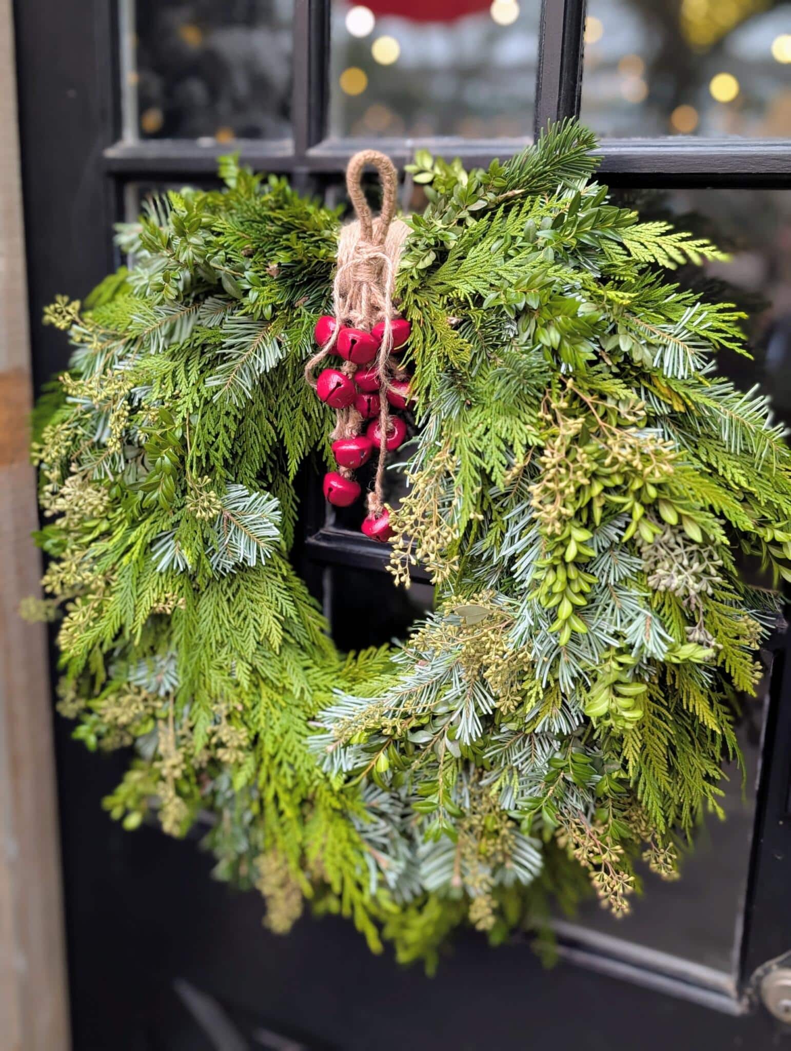- this wreath features a mix of lush pine varieties, crowned at the top with a cluster of cheerful bells that bring a whimsical, classic Christmas jingle