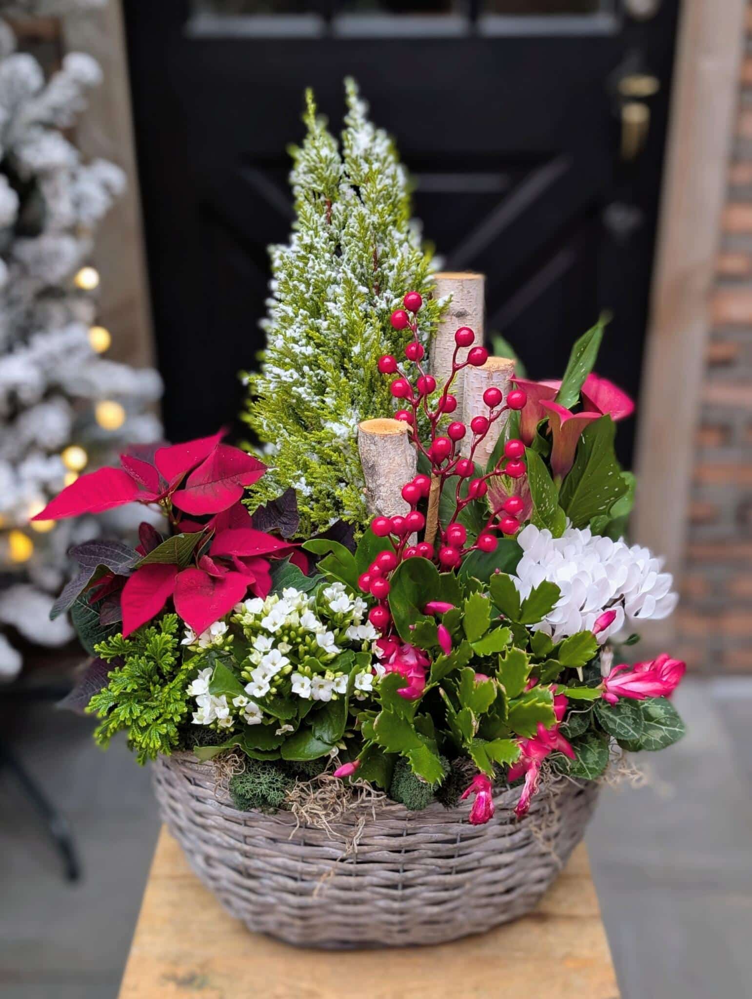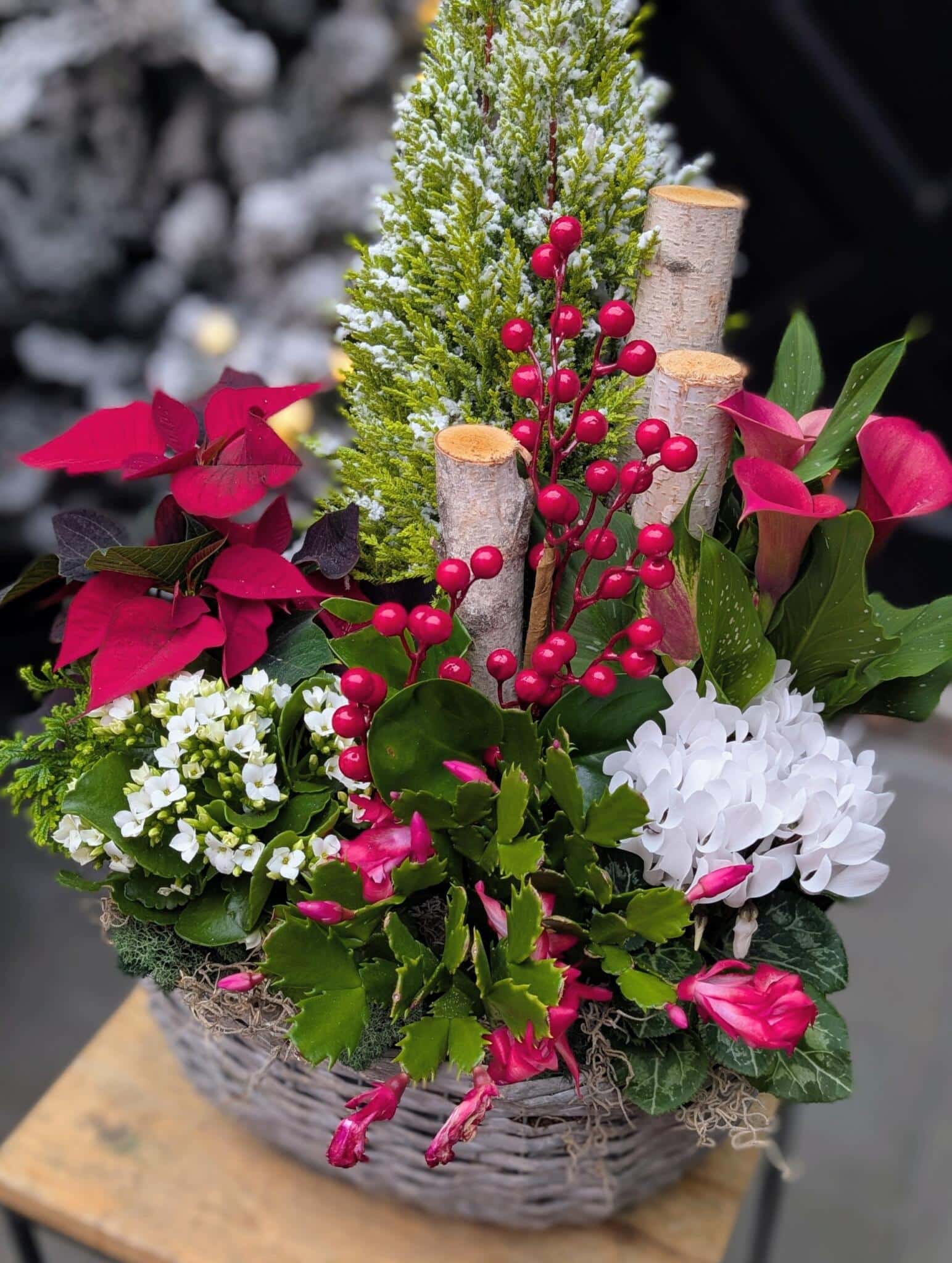 • winter classics like poinsettia and Christmas cactus, with red berry stems and birch accents adding a charming pop