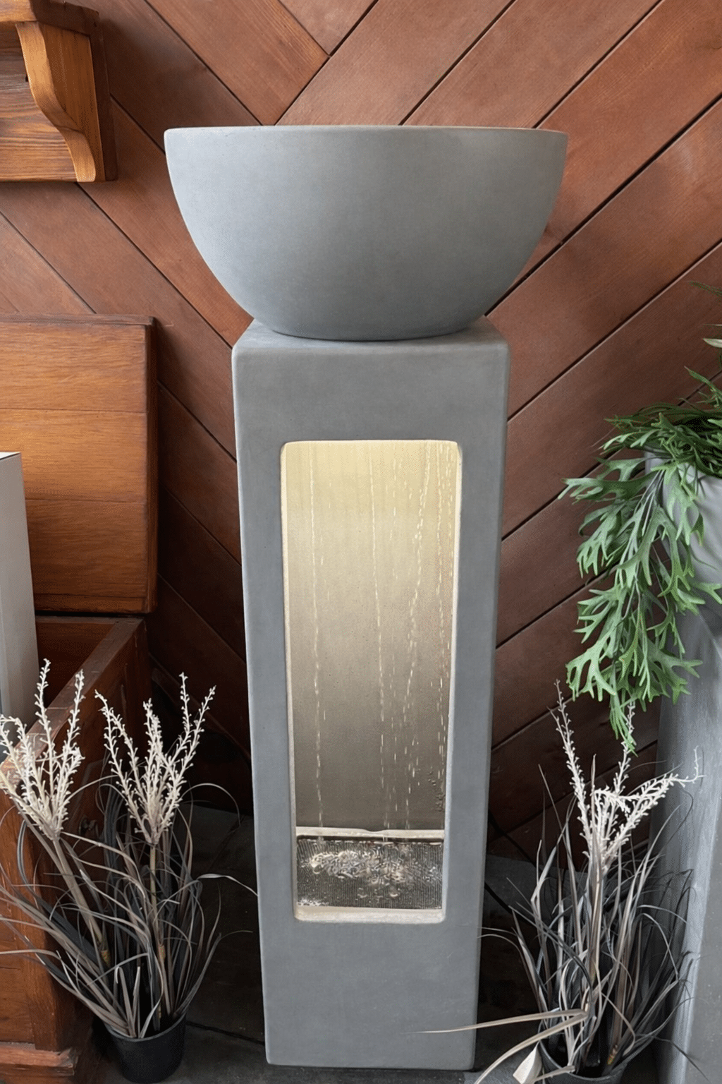 The Horizon Falls Fountain features a tall, sculptural column topped with a smooth bowl, where water gently spills and flows down the illuminated centre panel below. Its clean lines and soft cascading movement create a calming, modern statement piece that adds elegance, sound, and subtle ambiance to any setting.