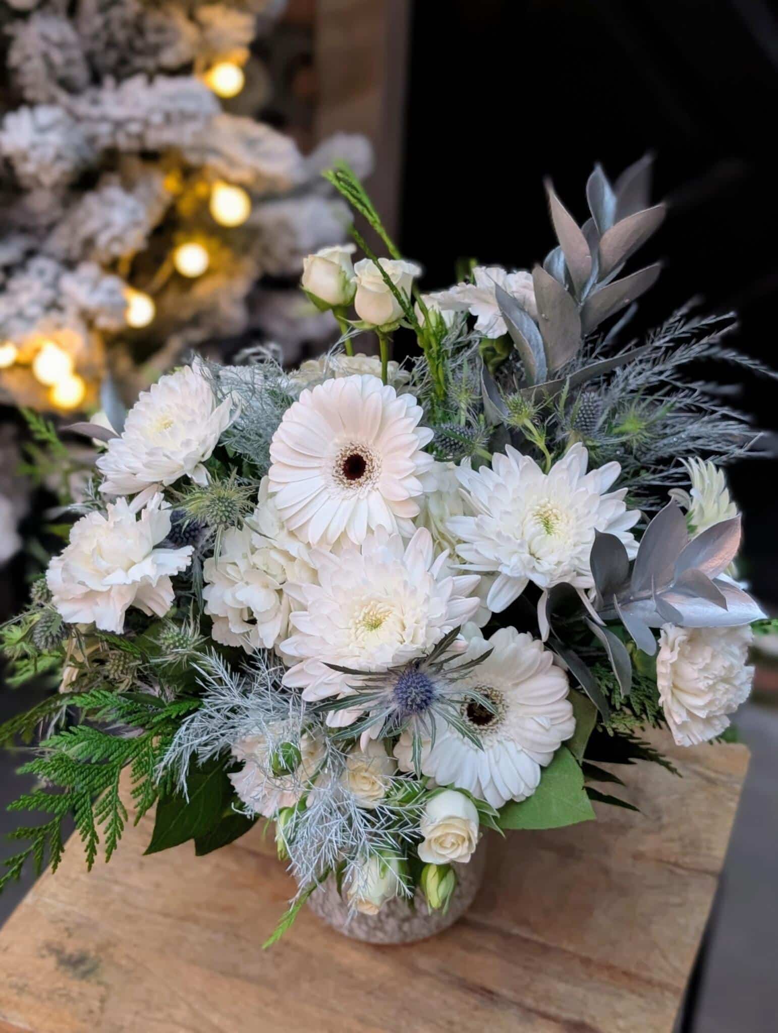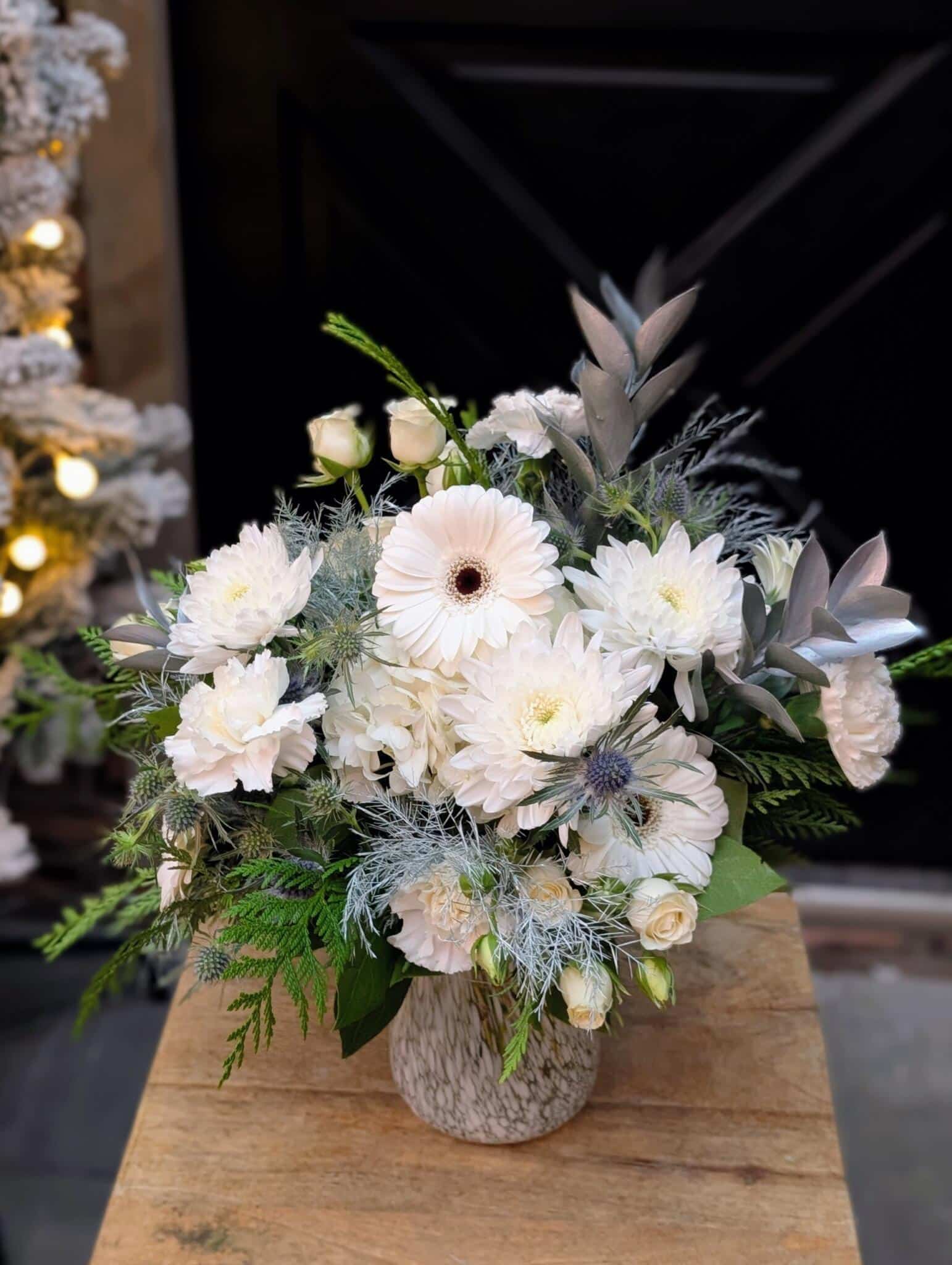 • This soft wintery arrangement comes in a beautiful white speckled vase