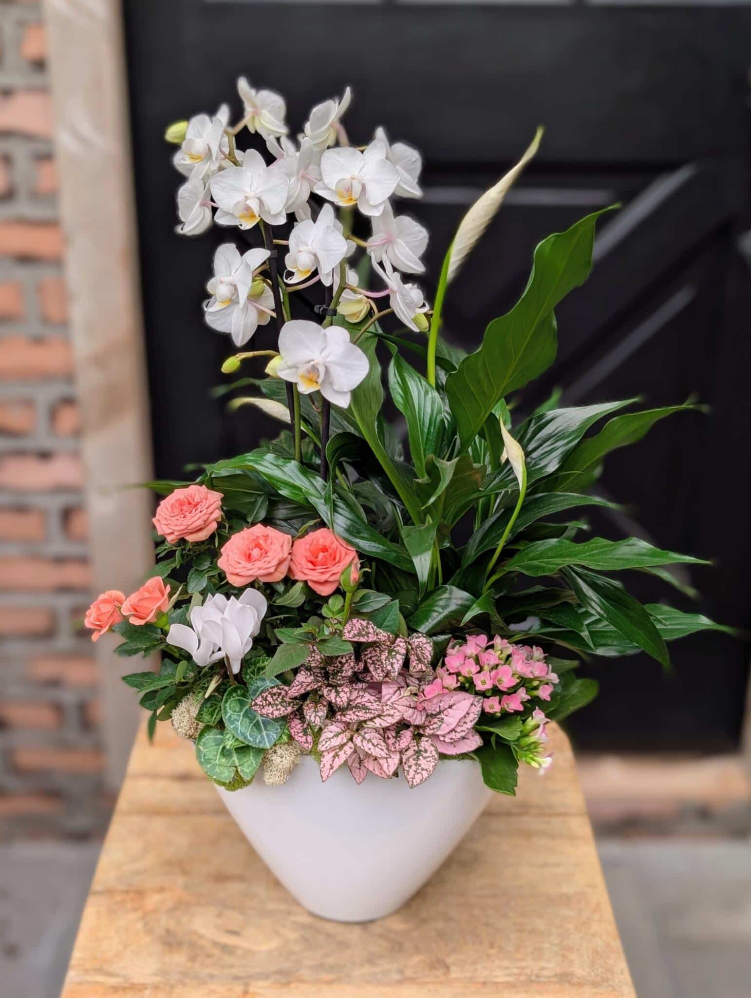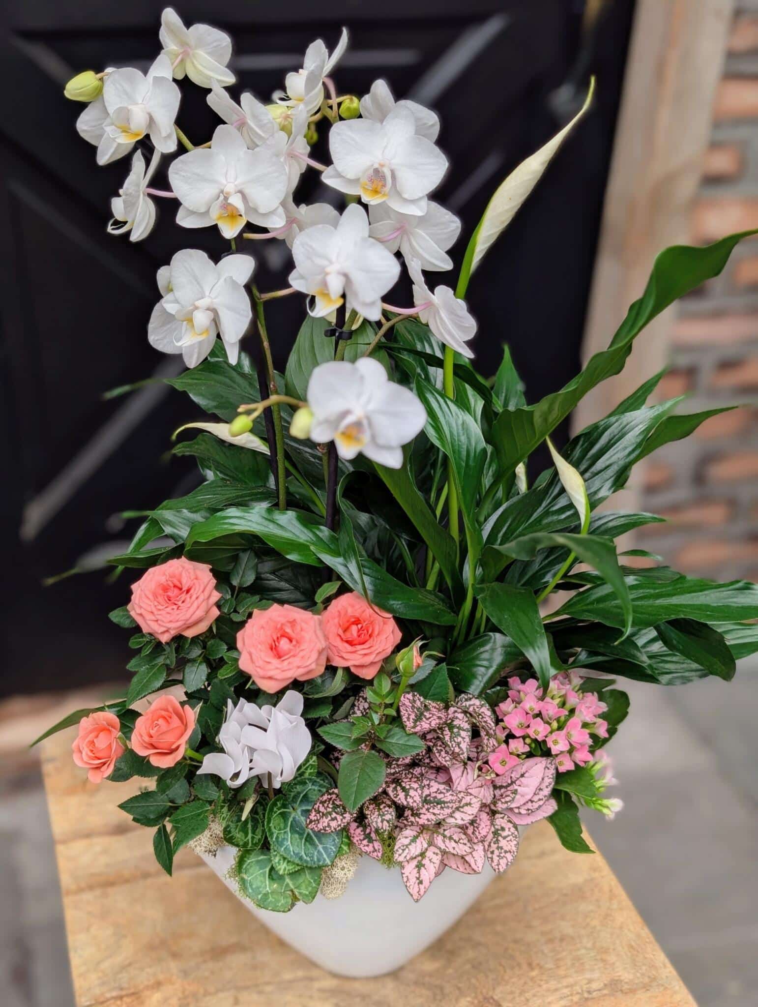 - featuring a beautiful white orchid and peace lily surrounded by simple flowering plants