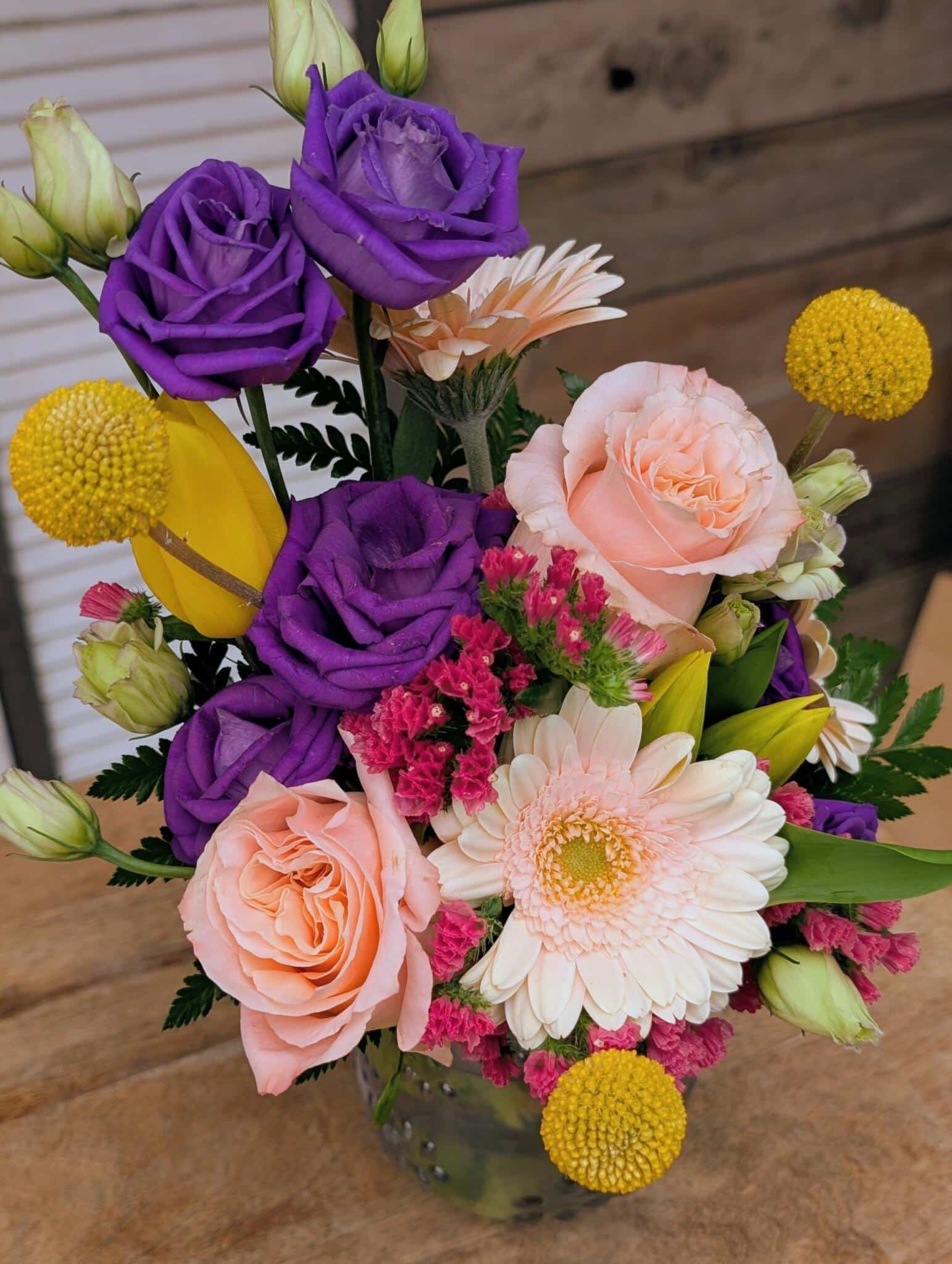 - featuring locally grown tulips, lisianthus, statice, and gerbera daisies