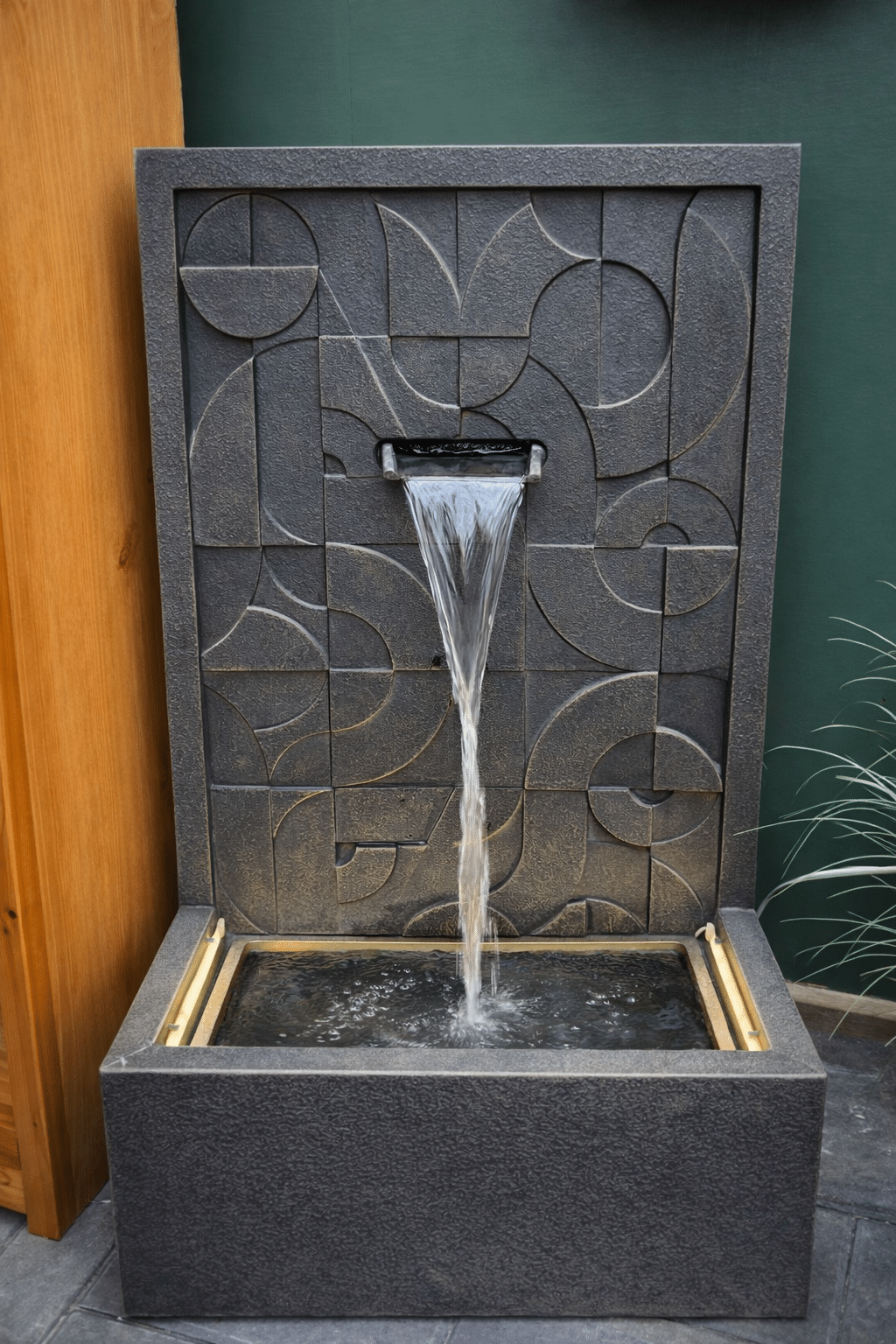 The Mosaic Flow Fountain features a striking geometric design paired with a smooth, cascading sheet of water that flows into a wide basin below. The textured surface and clean lines create a modern statement piece, while the gentle movement of water brings a soothing, relaxing presence to any setting.