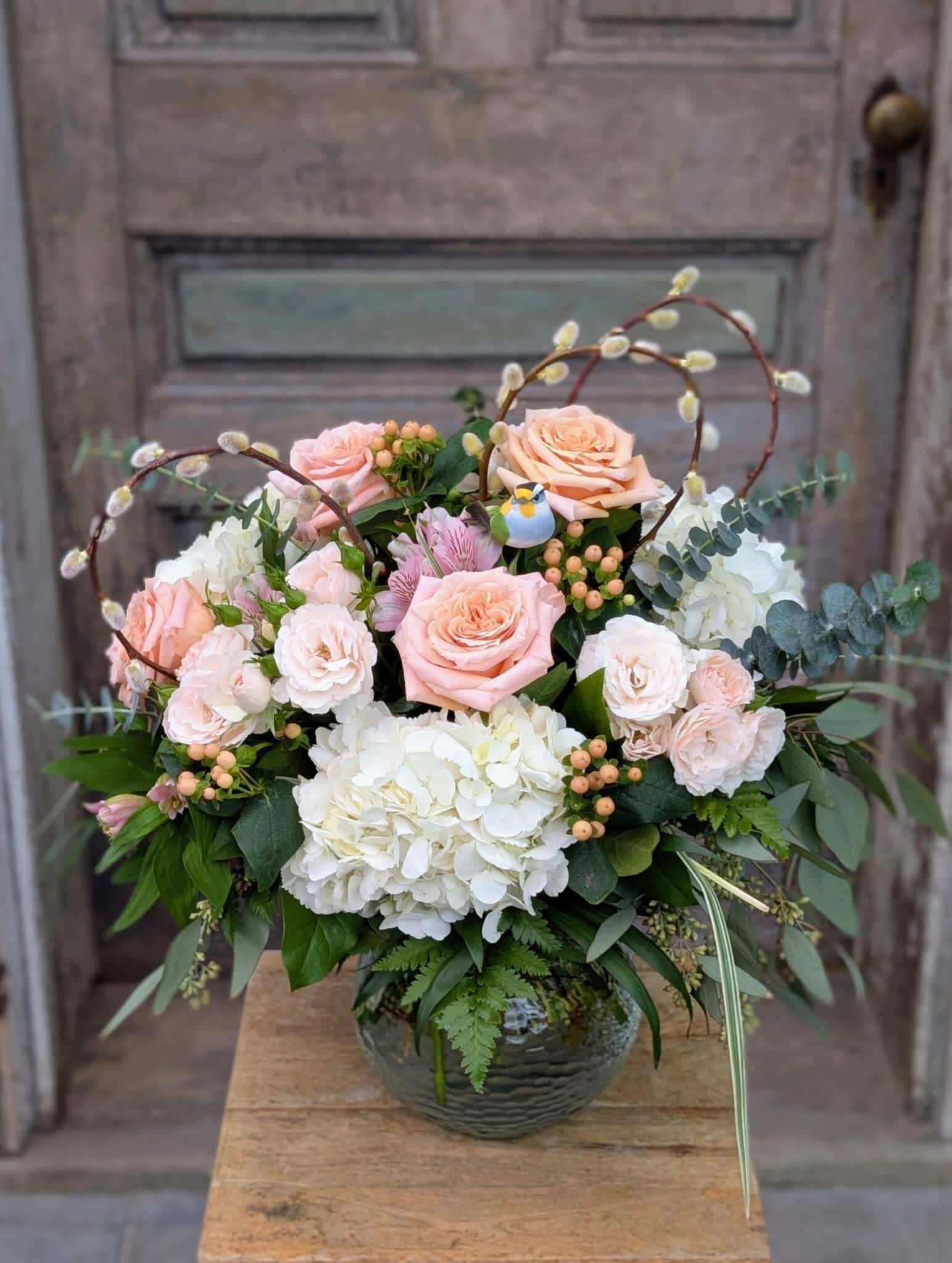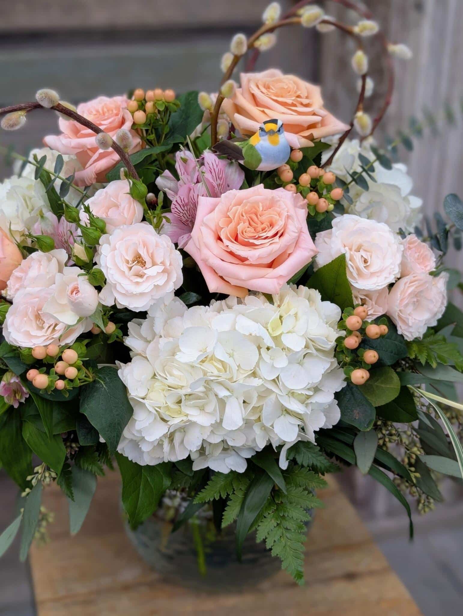 - White hydrangeas and curved pussy willows resemble a nest accompanied by a little bird, surrounded by roses and eucalyptus