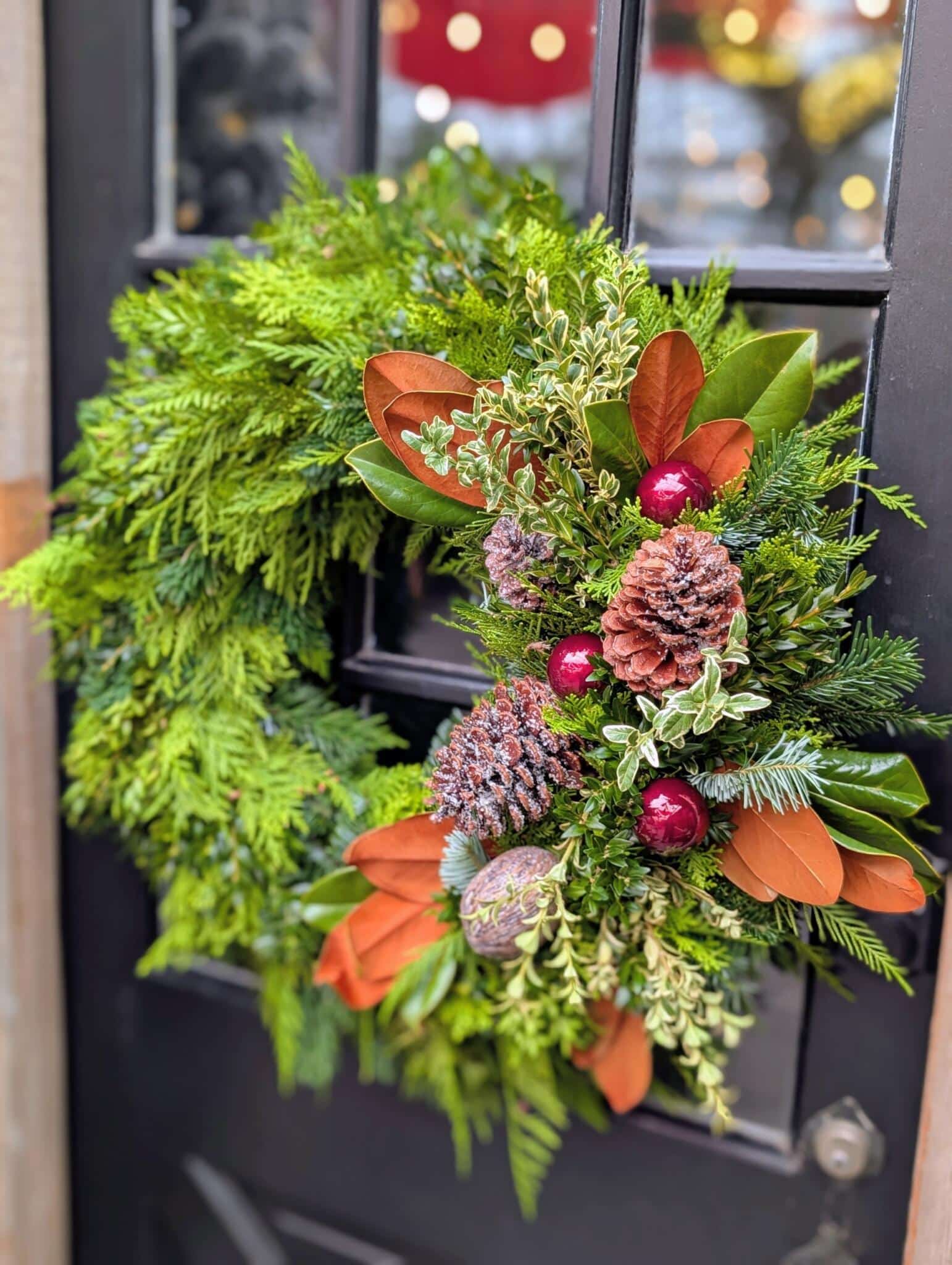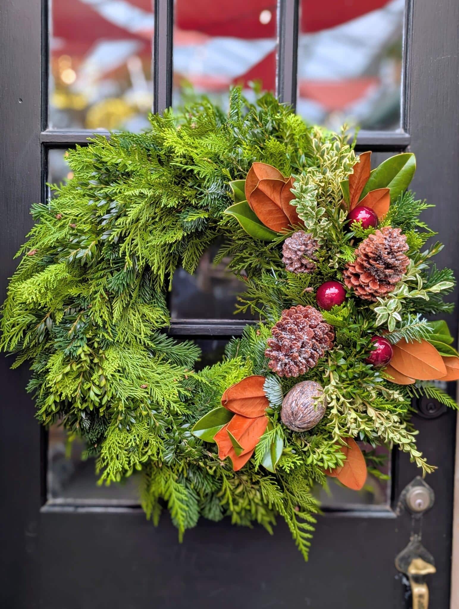 - a beautiful and full wreath with a nice and subtle holiday nod