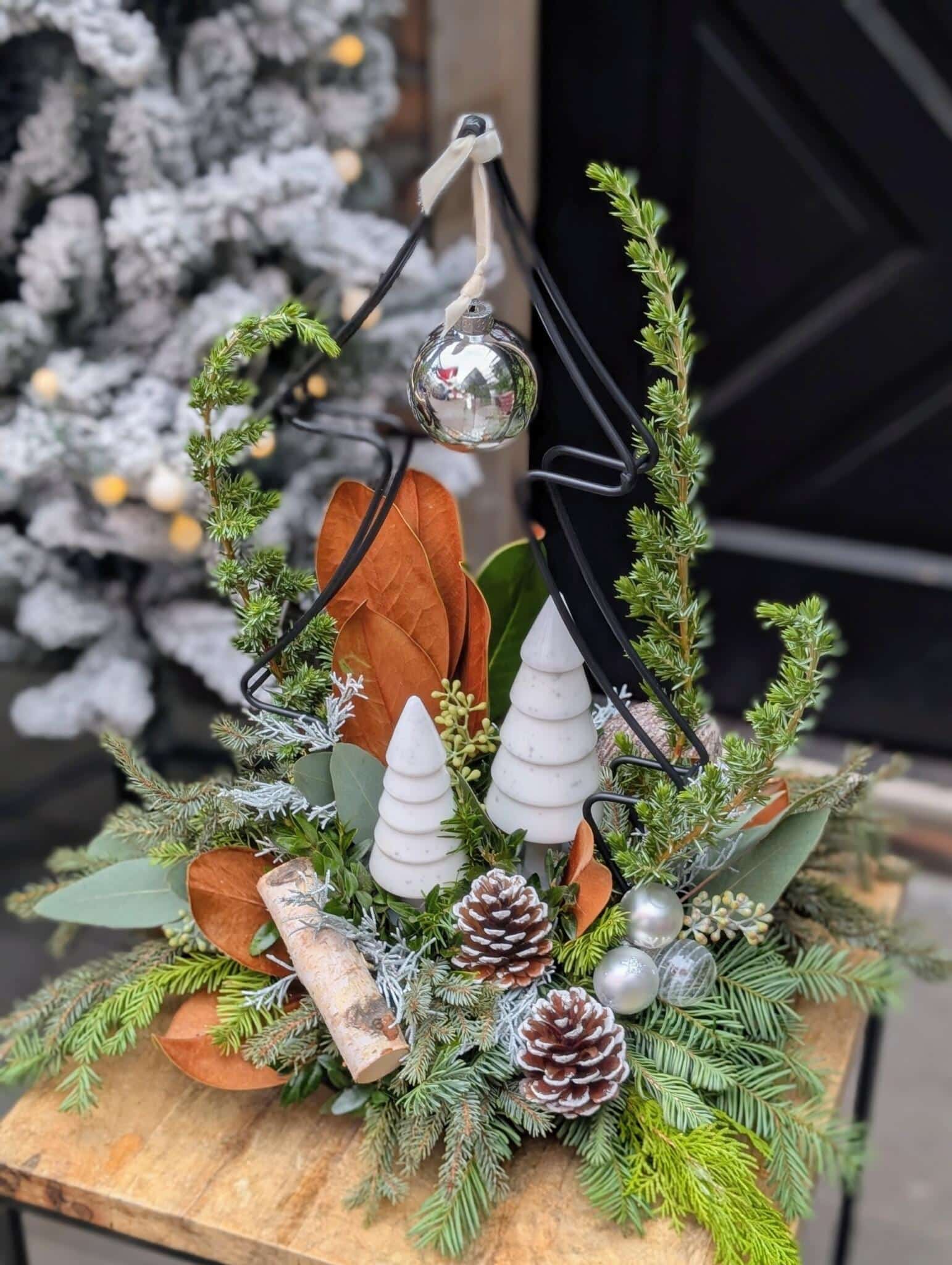 - this festive arrangement features layers of lush evergreen, frosted pinecones and ornamental trees