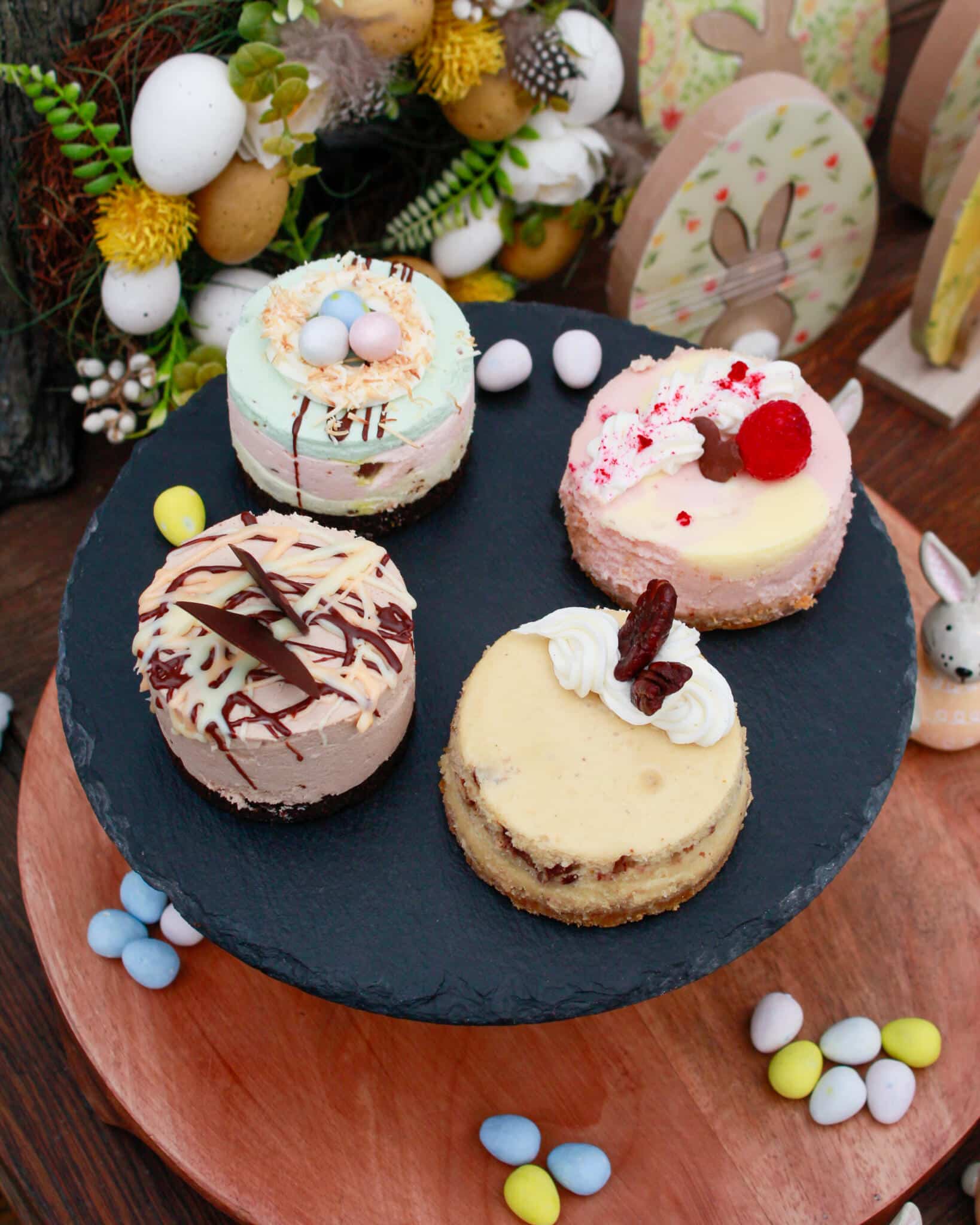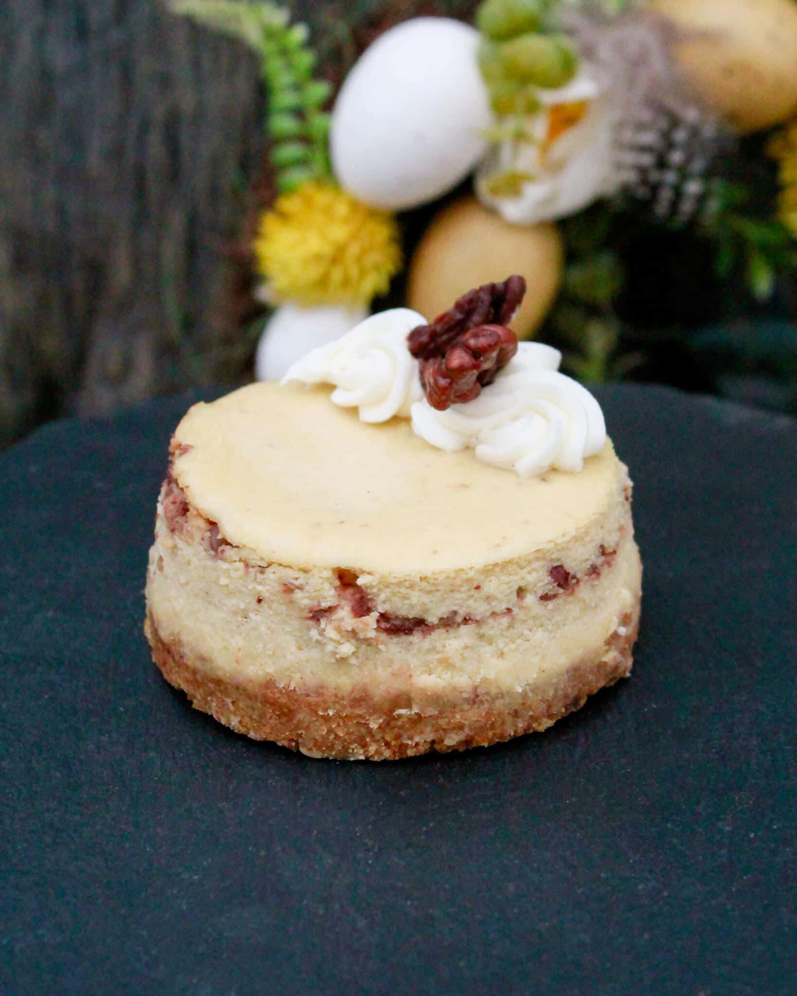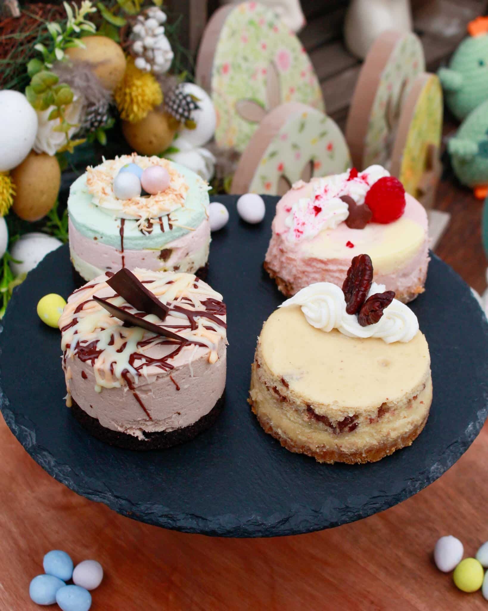 Mini Egg Cheesecake, Cream Egg Cheesecake, Raspberry White Chocolate Cheesecake, Brown Butter Maple Pecan Cheesecake.