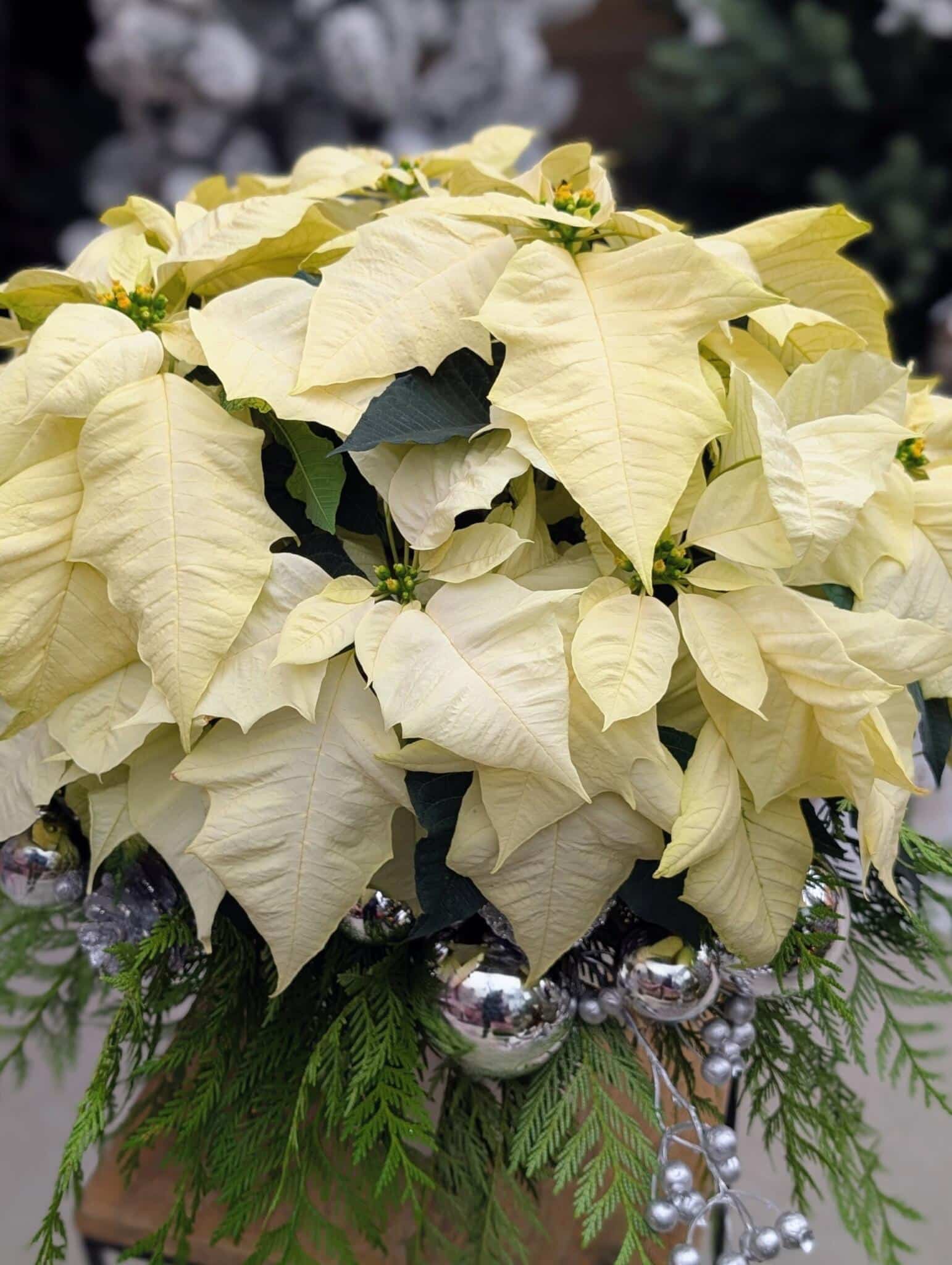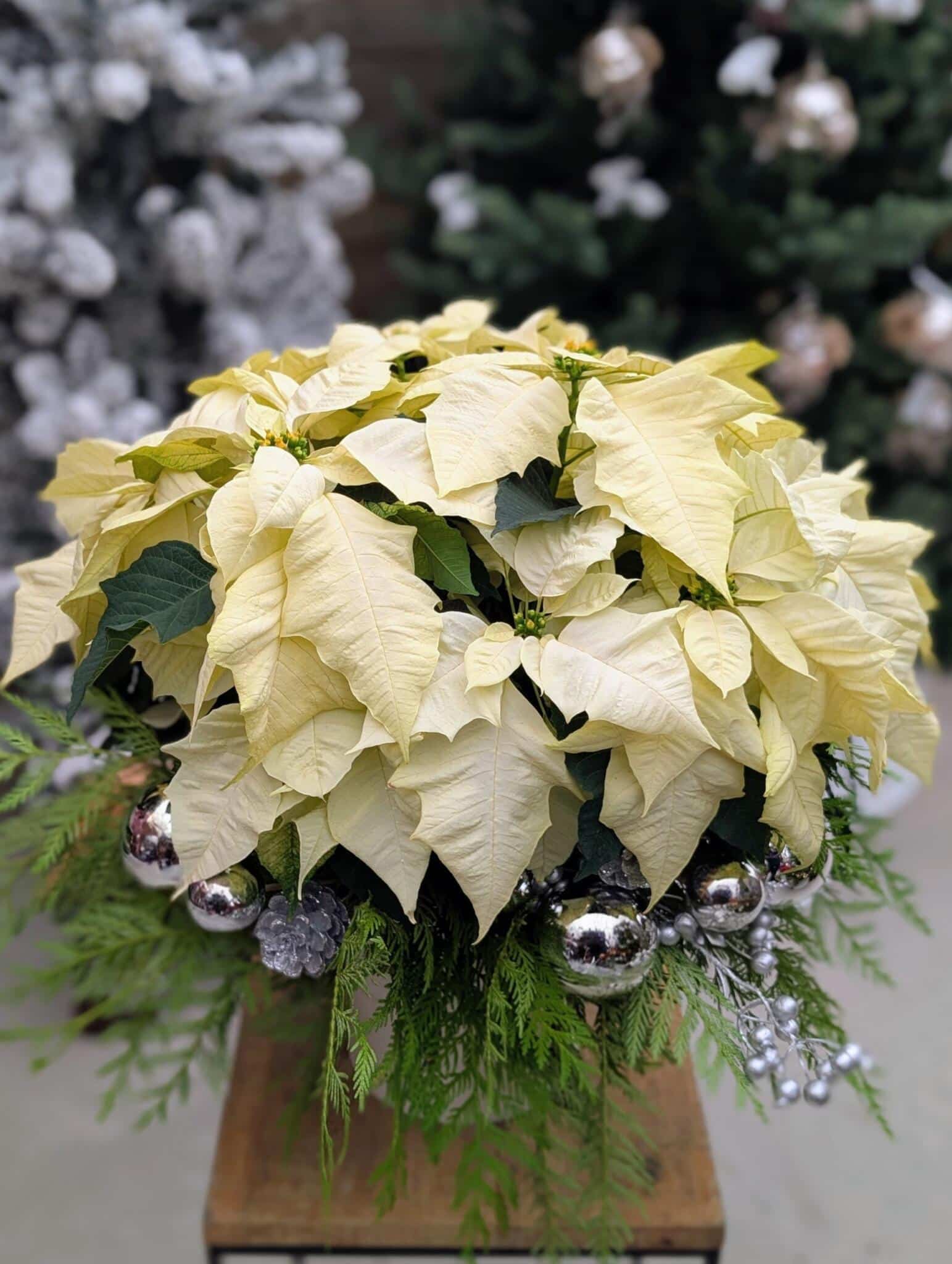 - An 8″ white poinsettia decorated with cedar and silver ornaments