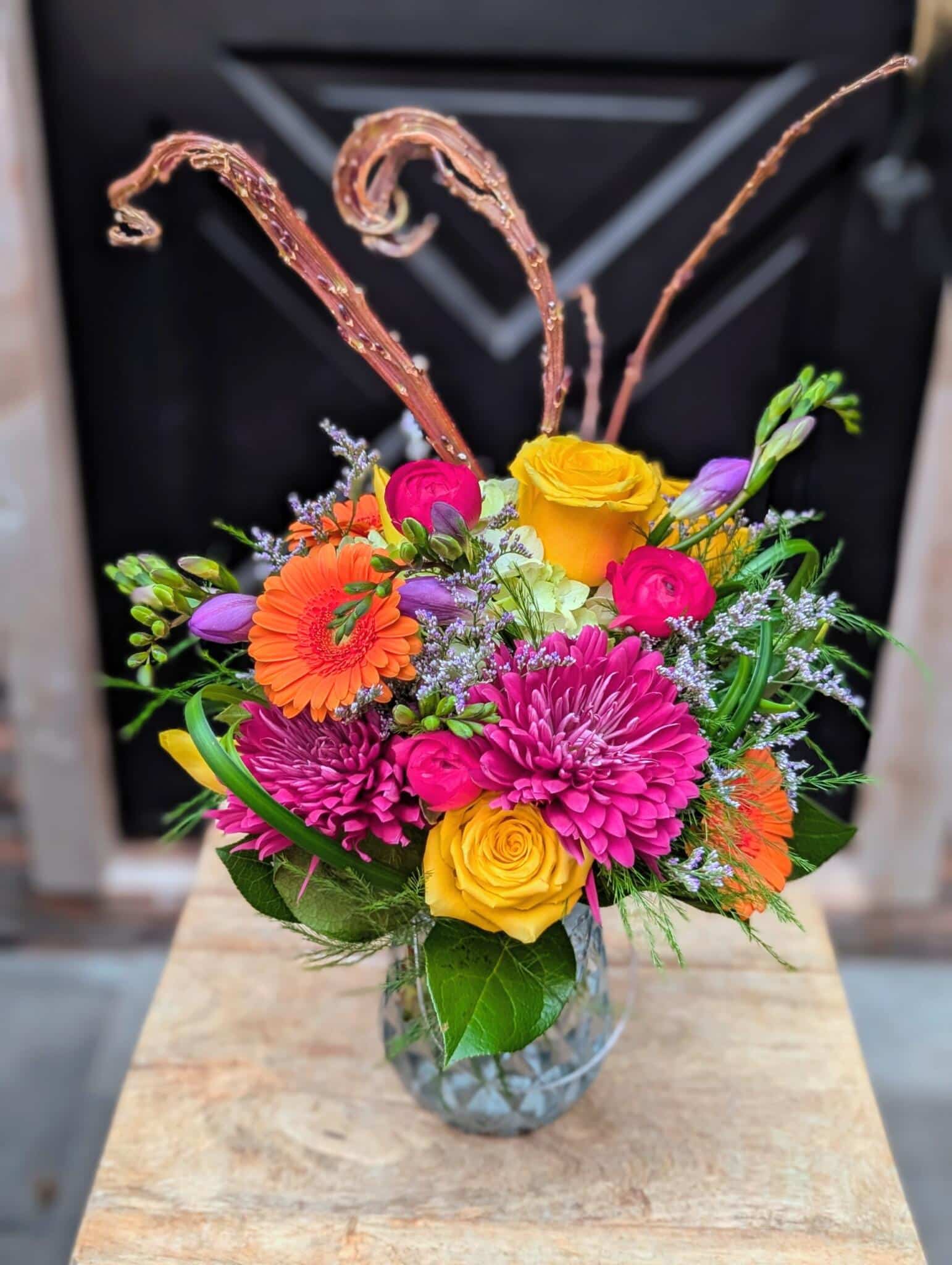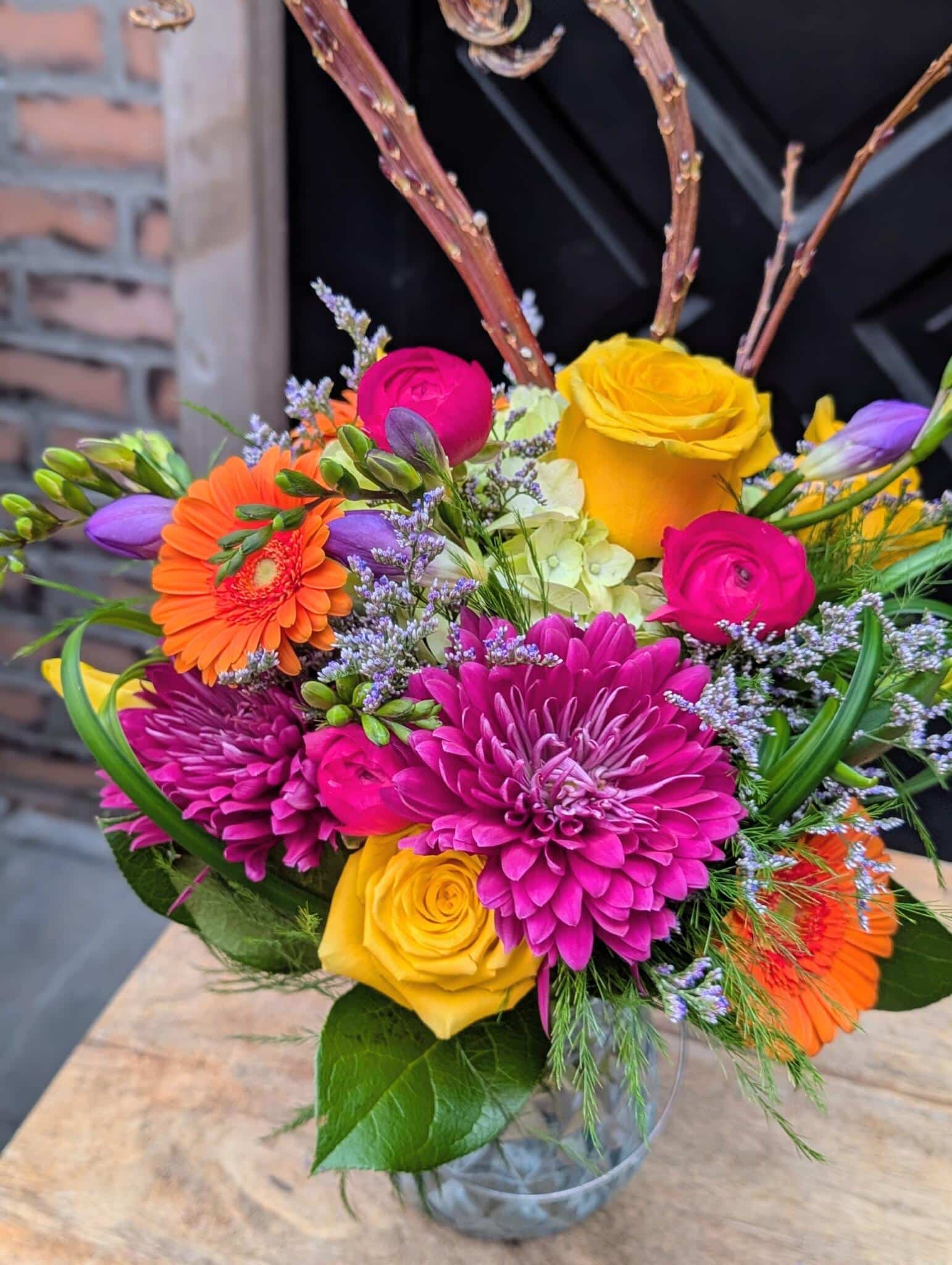 - features locally grown Niagara tulips, ranunculus, gerbera daisies and freesia
