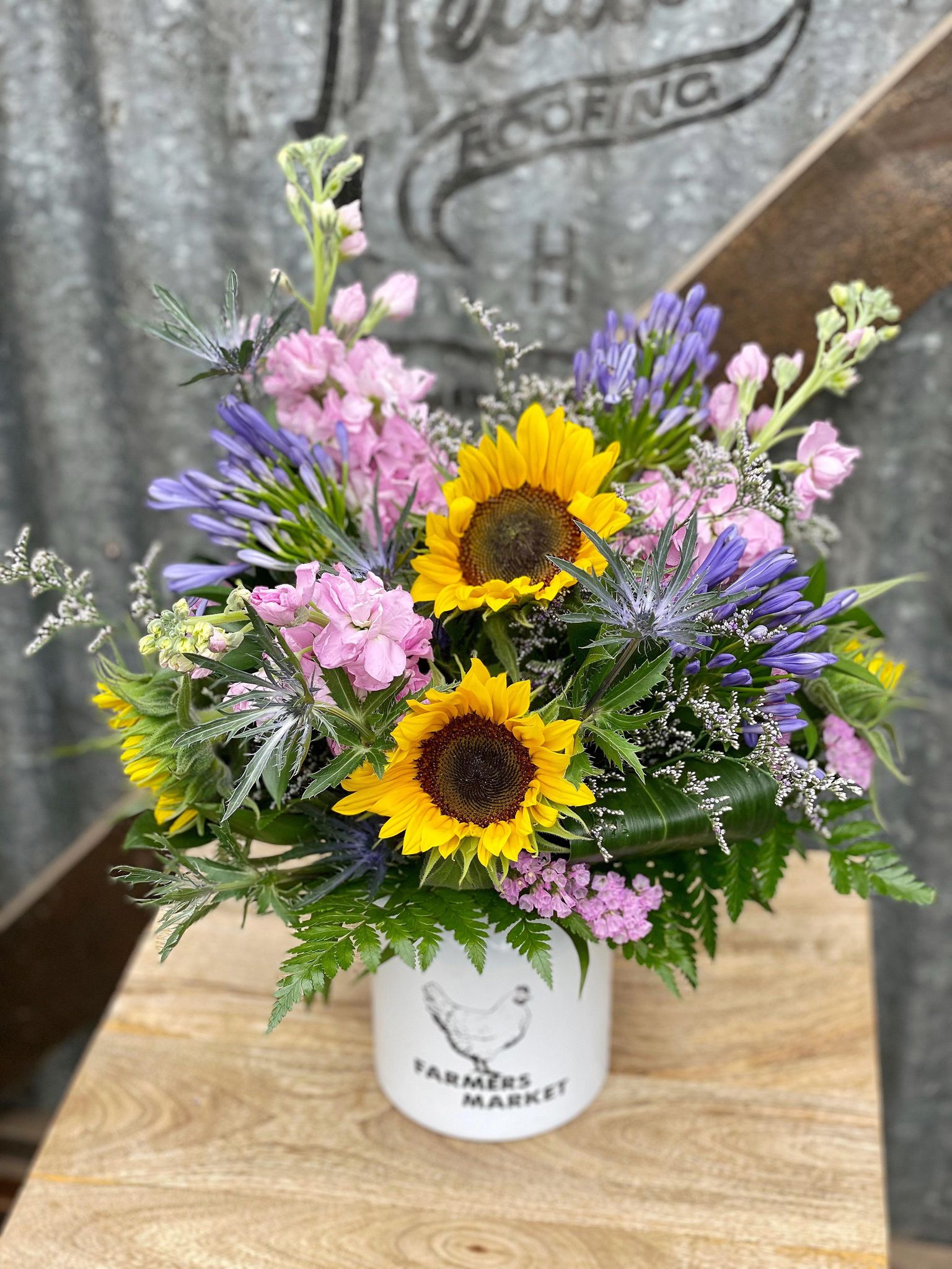 A fun, summer collection of beautiful blooms! Enjoy watching locally grown sunflower petals open to display their full beauty while you savour the fragrant stocks. Purple agapanthus peak out between the limonium and statice creating a fresh summer palette. This bouquet is displayed in a white farmers market container.