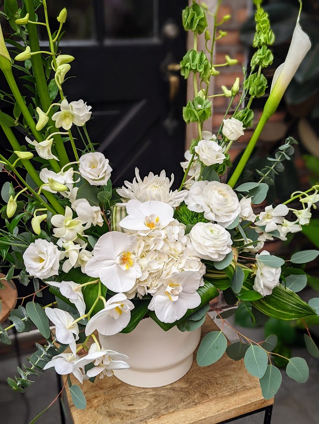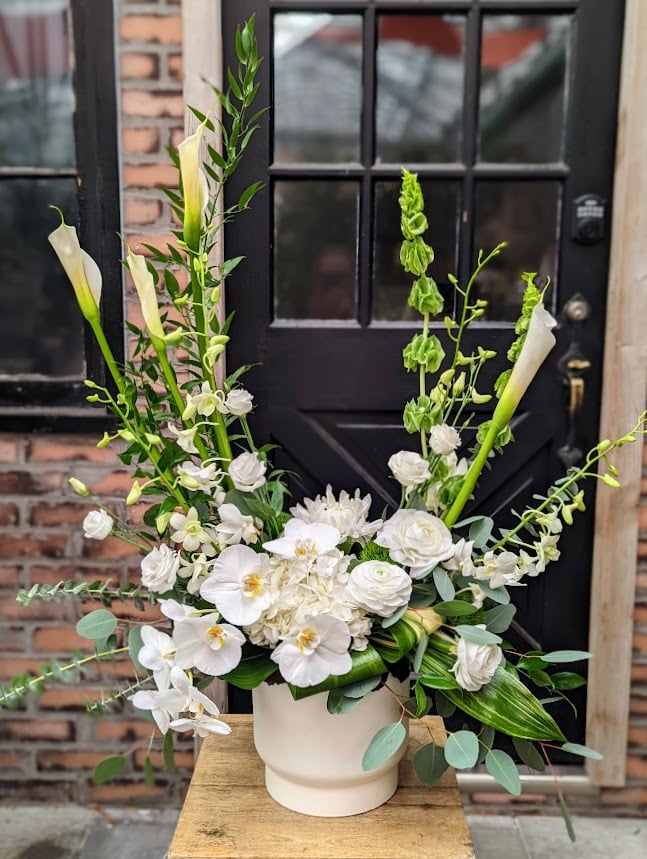 - featuring elegant calla lilies, bells of Ireland and various variants of orchids
