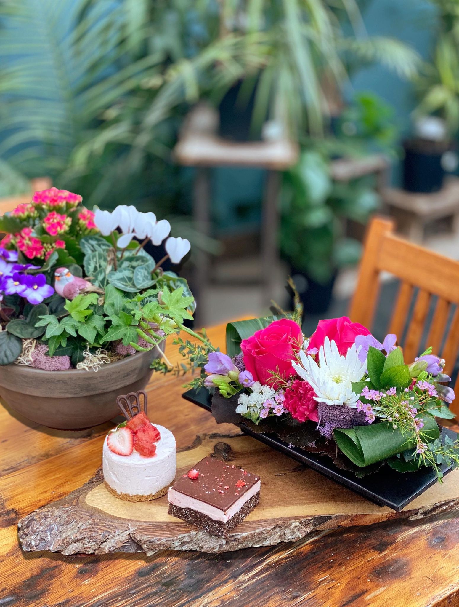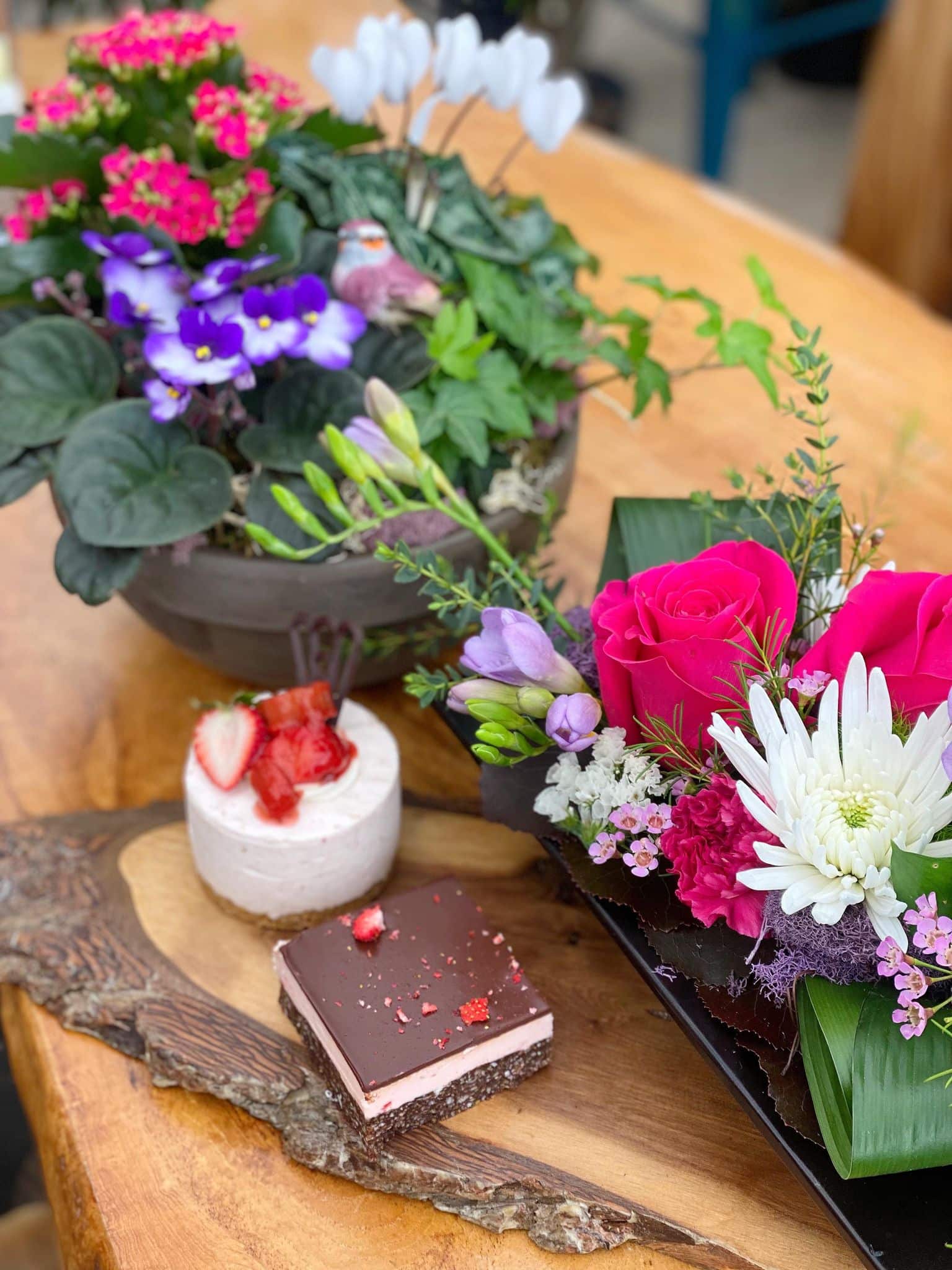 This collection offers 3 different items.  A stunning planter that will continue to bloom and grow for months to come, a beautiful fresh floral arrangement overflowing with fresh bloom in pinks, lavenders and whites and a delicious cheesecake and strawberry nanaimo baked fresh from our Pastry Market.