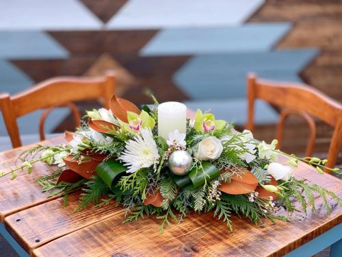 The breath of cold winter air on rosy cheeks this stunning bouquet combines soft lilies, roses, gerbera daisies and mums with cedar and pine cones.