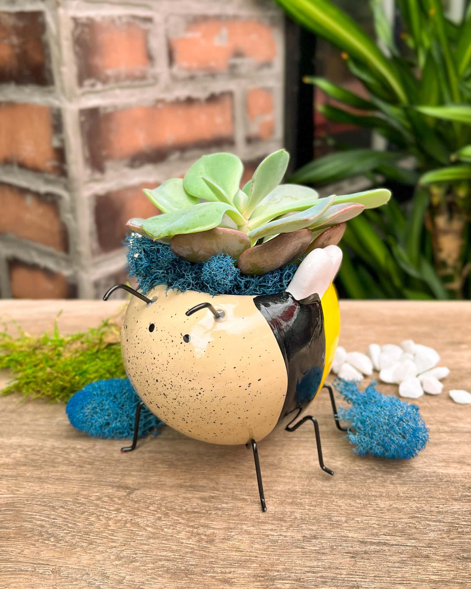 Nestled with a sweet succulent and soft blue moss, it’s a little hive of colour and charm for any shelf or windowsill.