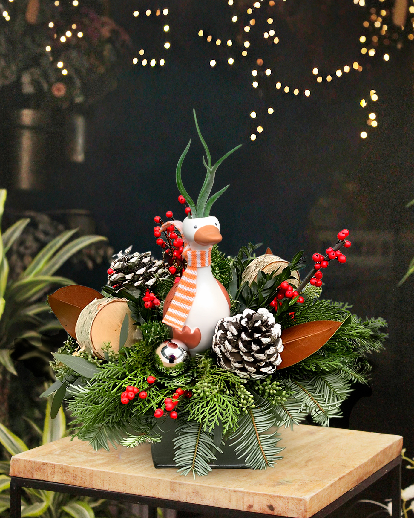 Sprouting from its head, a spiky and funky air plant adds just the right touch of playful flair. It’s a merry mix of natural textures, bright pops of colour, and quirky personality—perfect for bringing a little laughter and a lot of charm to your holiday table.