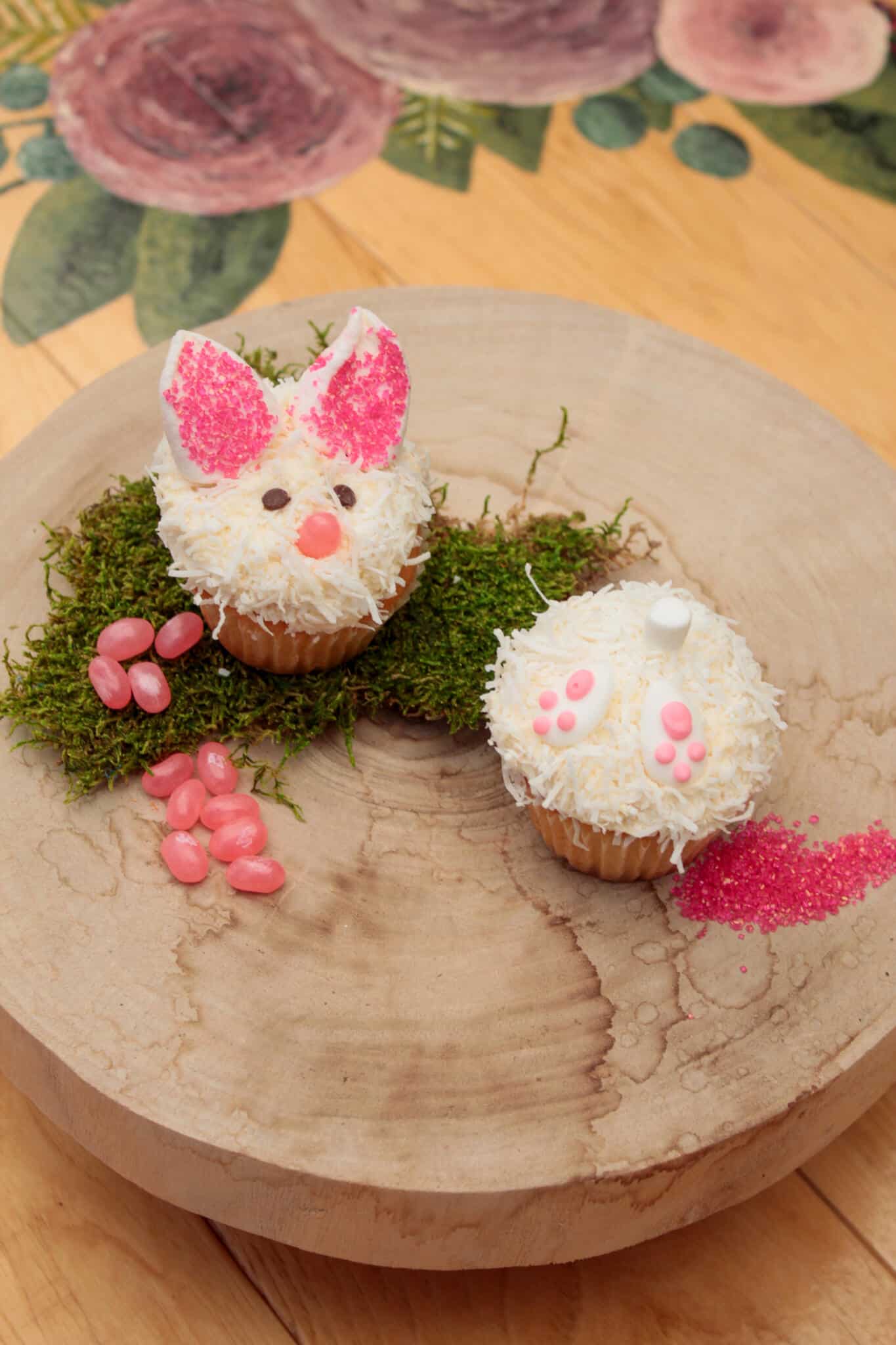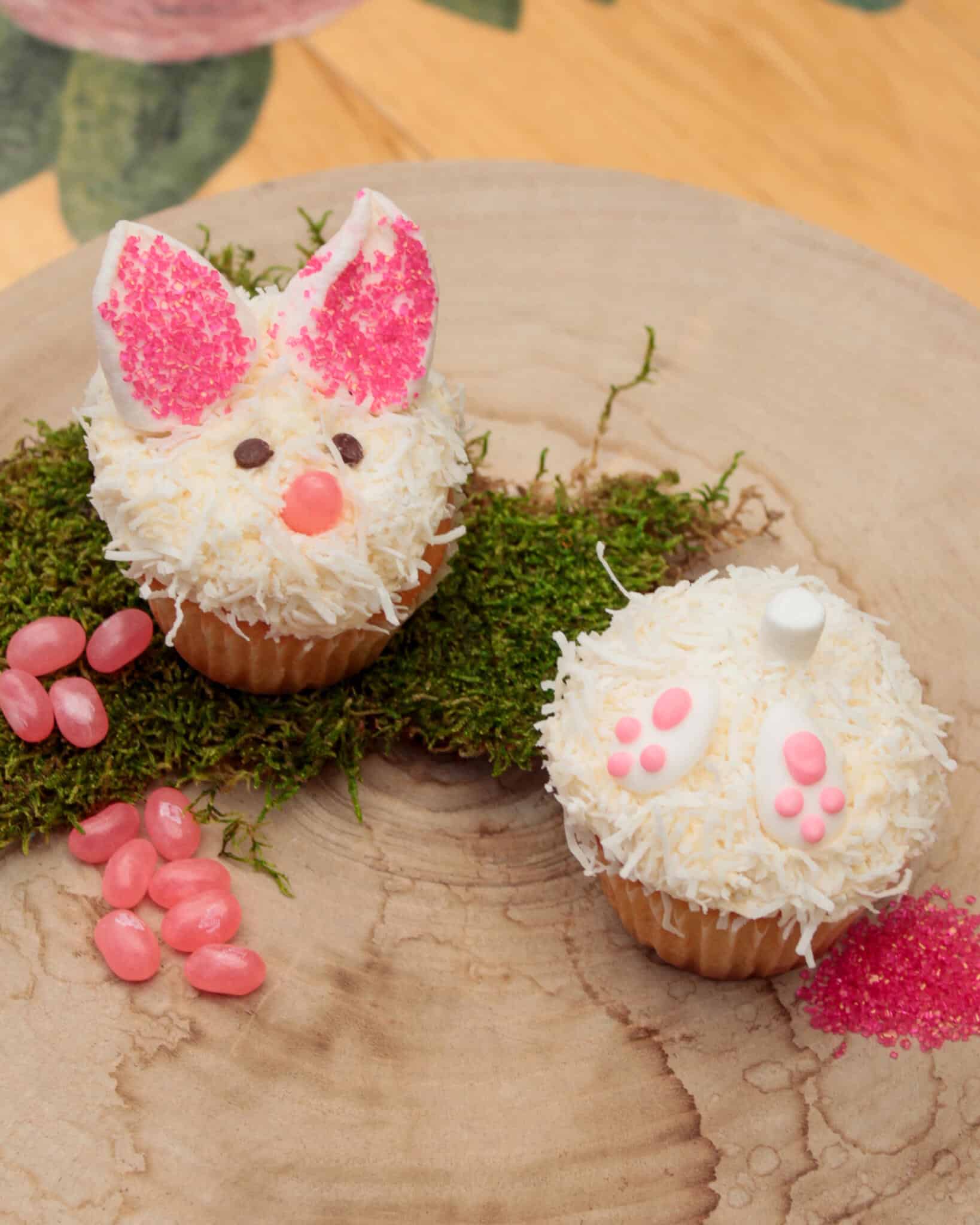 You will transform two super fluffy cupcakes into a cute bunny face and tail!
