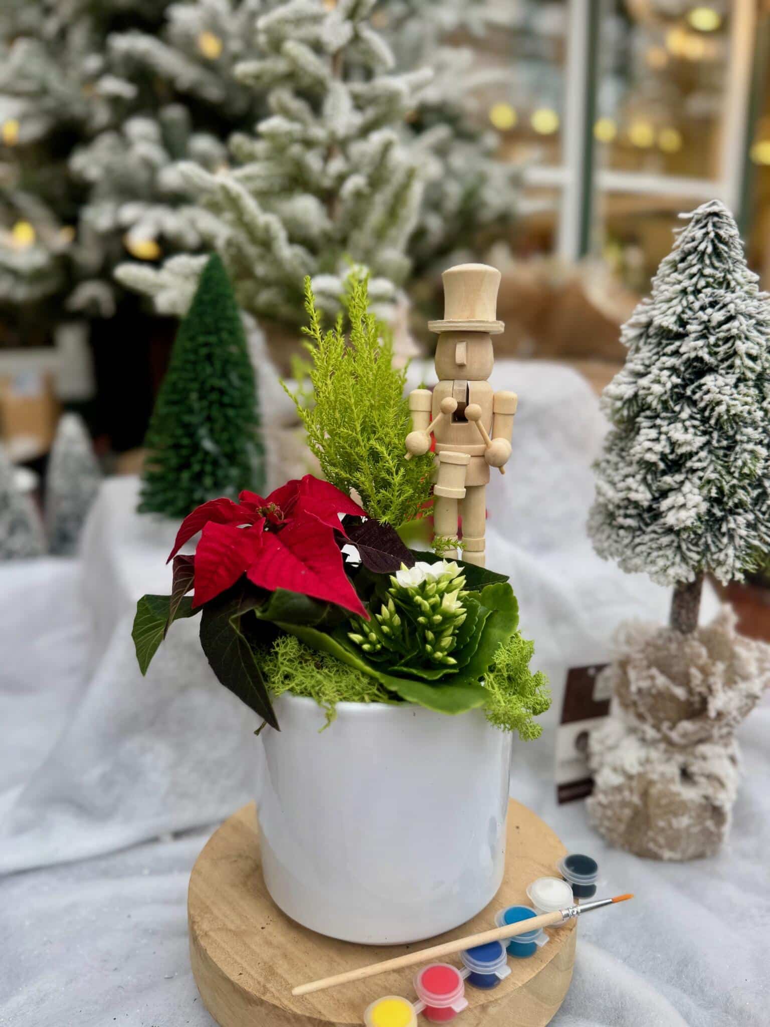 Kids (and adults!) can add an extra touch of fun by painting their very own nutcracker to accompany the greenery. Perfect as a creative gift or a cheerful holiday activity, this planter combines hands-on fun with seasonal beauty.