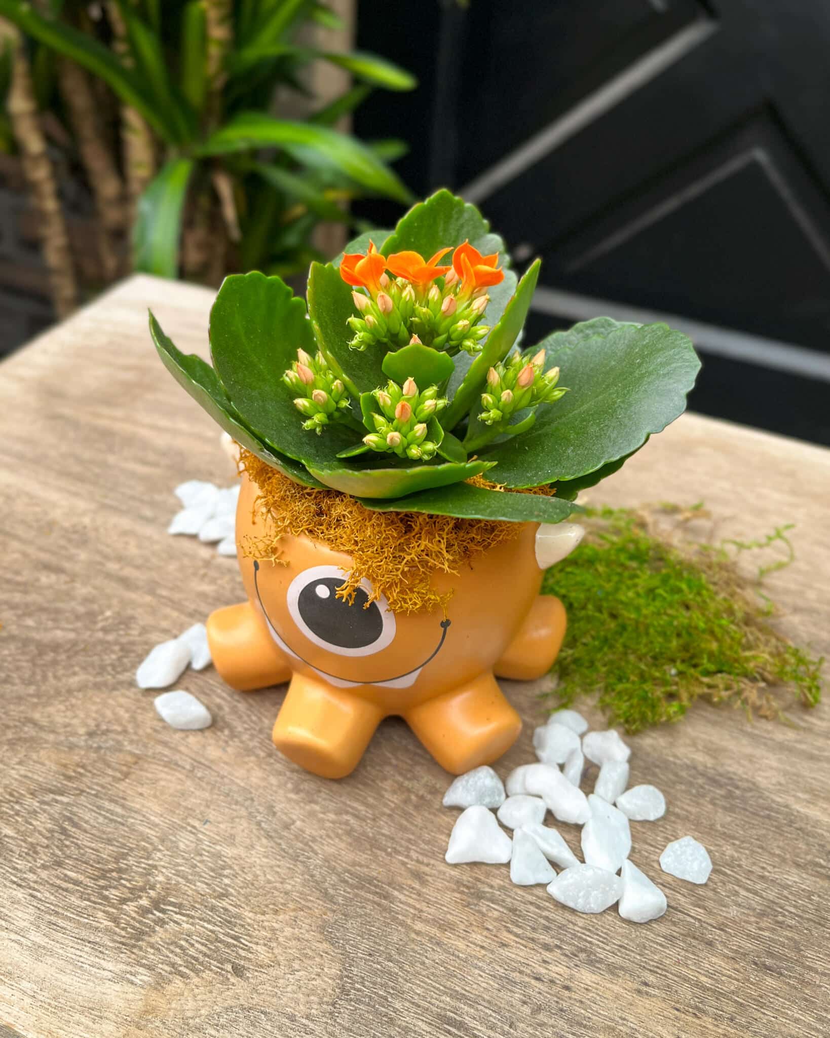 A spunky kalanchoe peeks out from its quirky home, surrounded by moss that give it personality and charm.