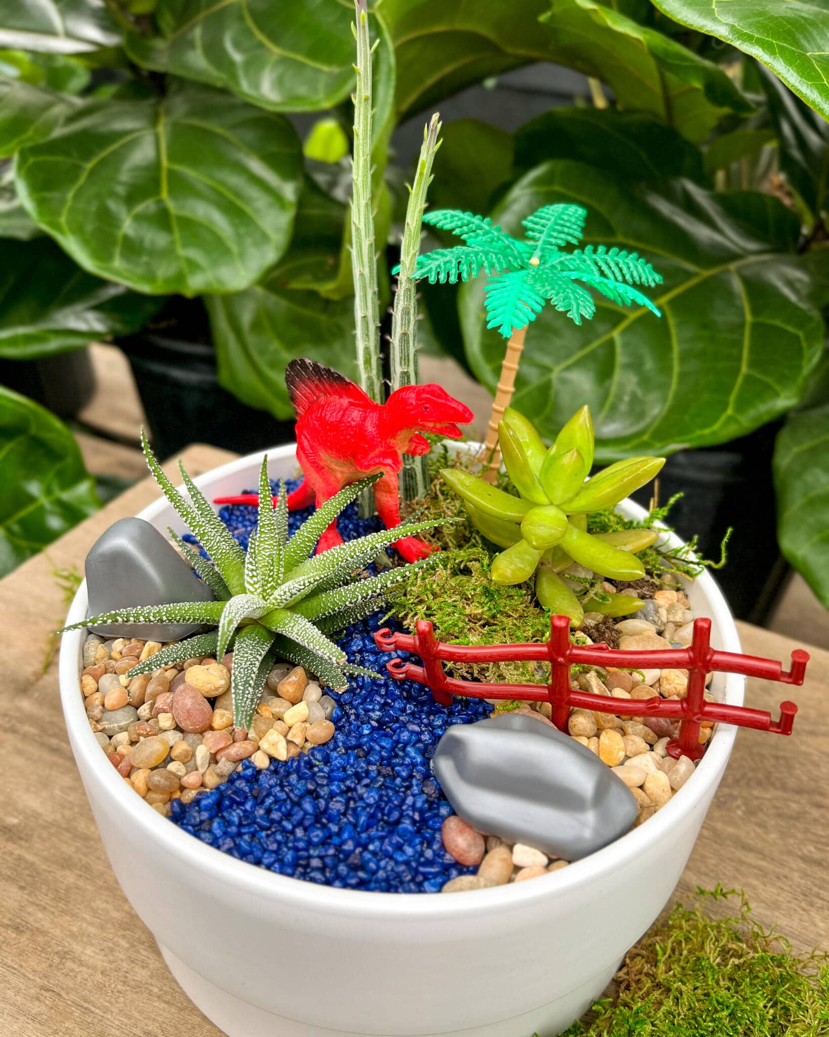 This planter is filled with a variety of unique succulents and fun decorations to design a dino-inspired scene. It even includes a dinosaur figurine you can play with long after your garden adventure is complete!