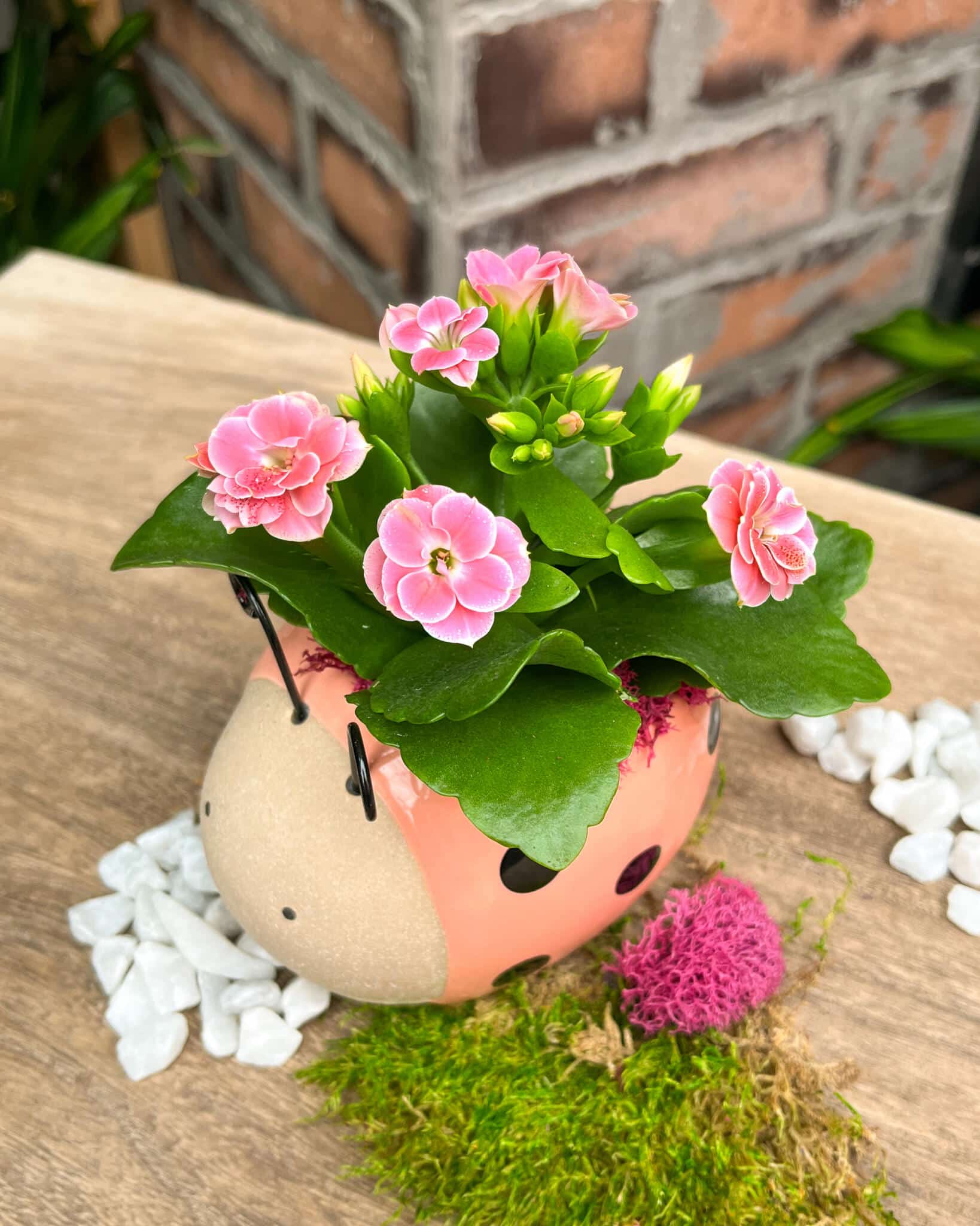 Nestled with a blooming pink kalanchoe and soft pink moss, it’s a perfectly coordinated pop of happiness for any space.