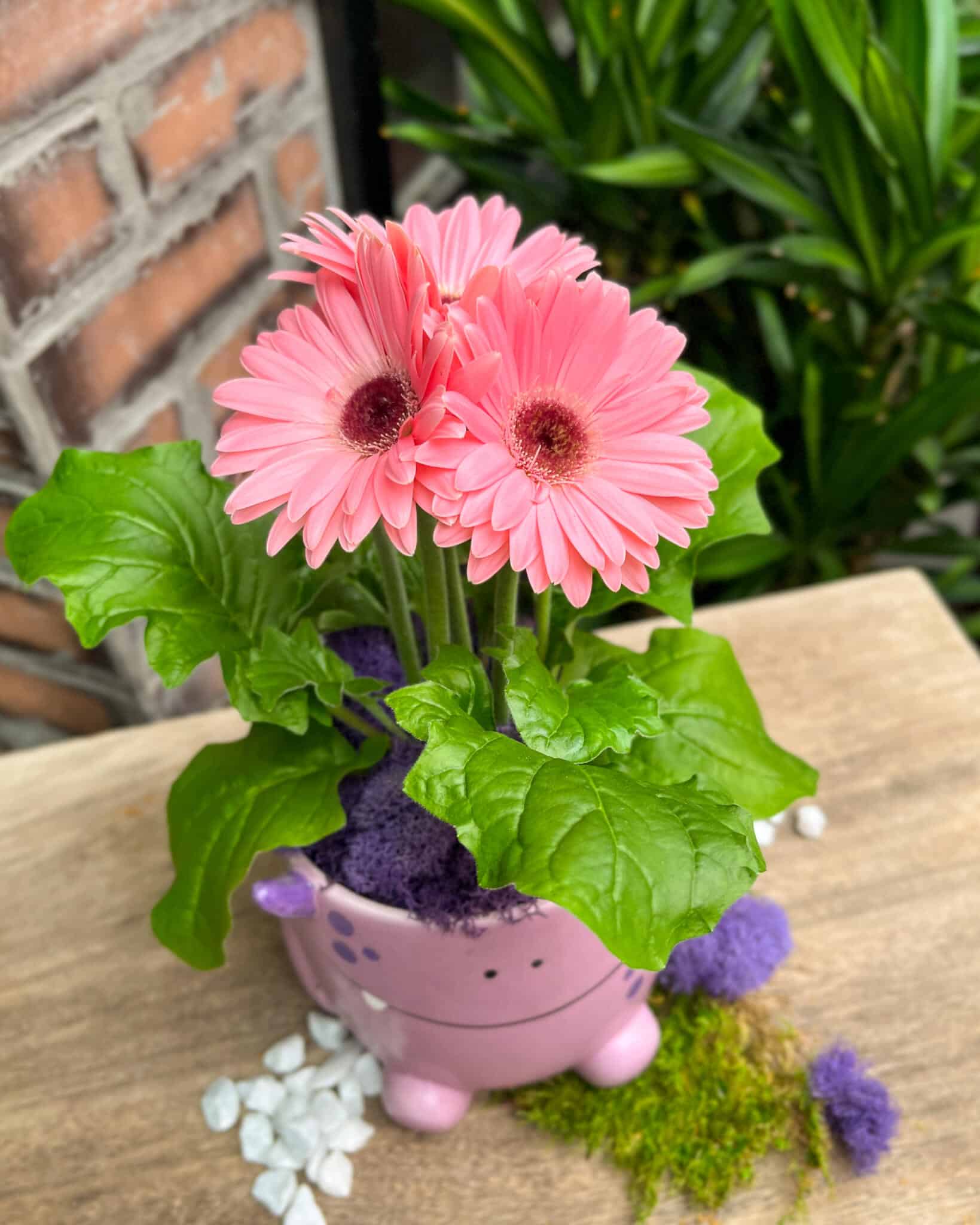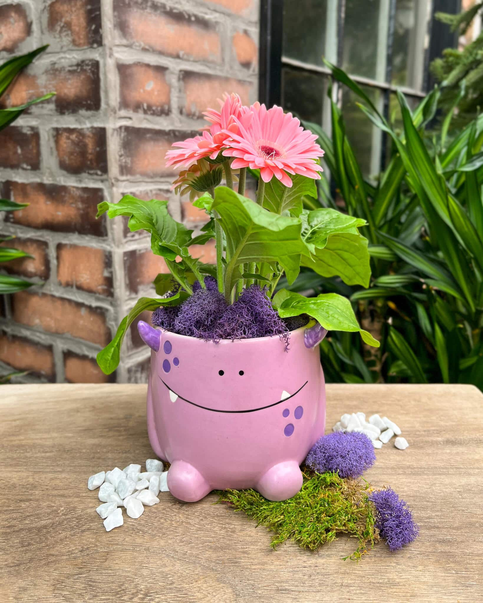 He’s holding a bright gerbera plant with soft moss, making him the happiest little helper. He’s fun, friendly, and ready to bring giggles and colour to any room!