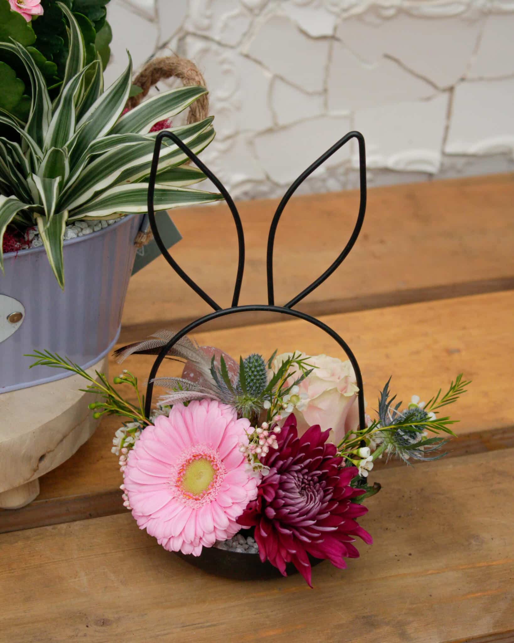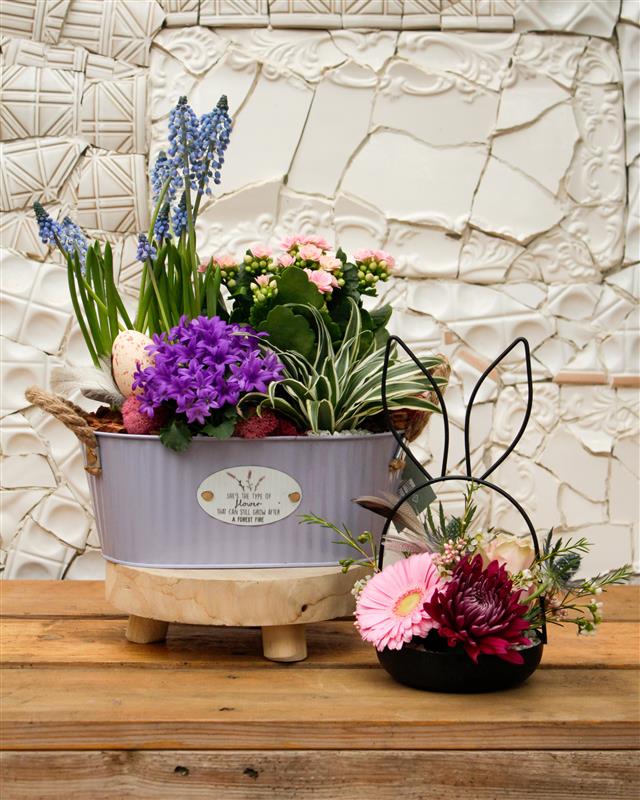 Create a beautiful two-piece Easter set featuring one fresh-flower arrangement and one lush planted design. You’ll combine seasonal bulbs, kalanchoe, greens, and decorative eggs in the planter, then craft a charming bunny-ear floral piece filled with fresh blooms and soft textural accents. A lovely duo to bring Easter charm into your home.