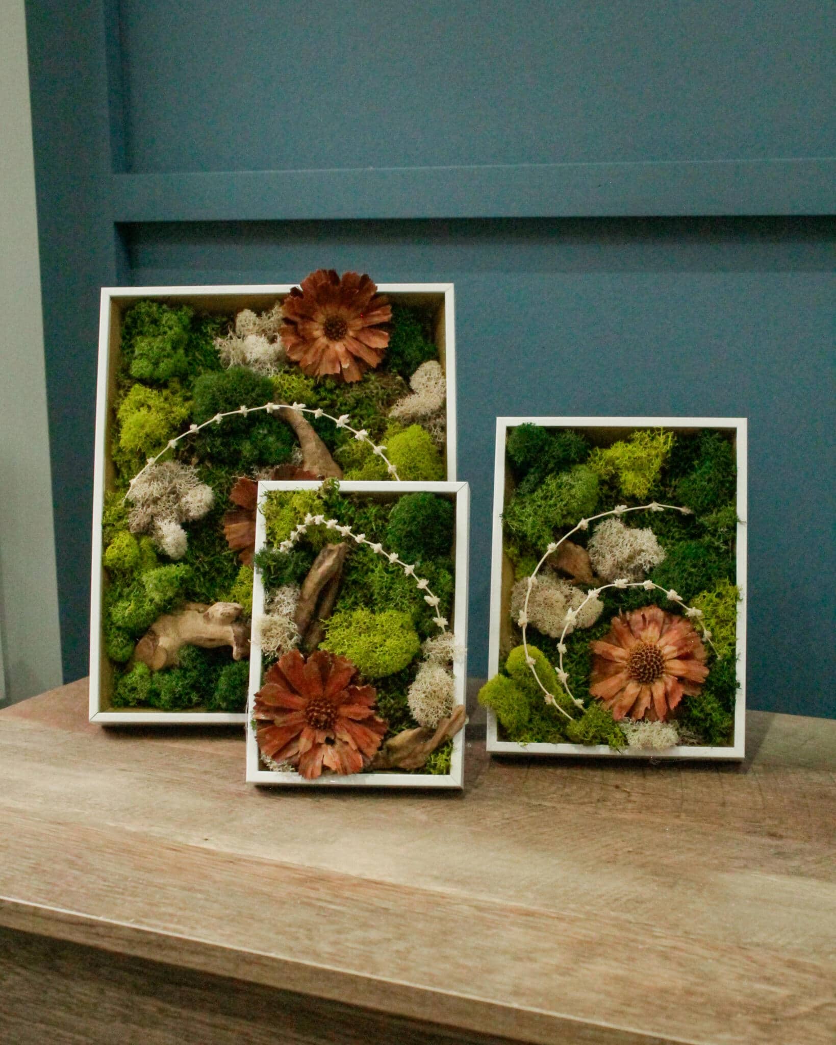 Searching for a fresh idea to enhance your home? Why not design a set of three, all natural moss art that can be displayed on a shelf or hung on your wall.