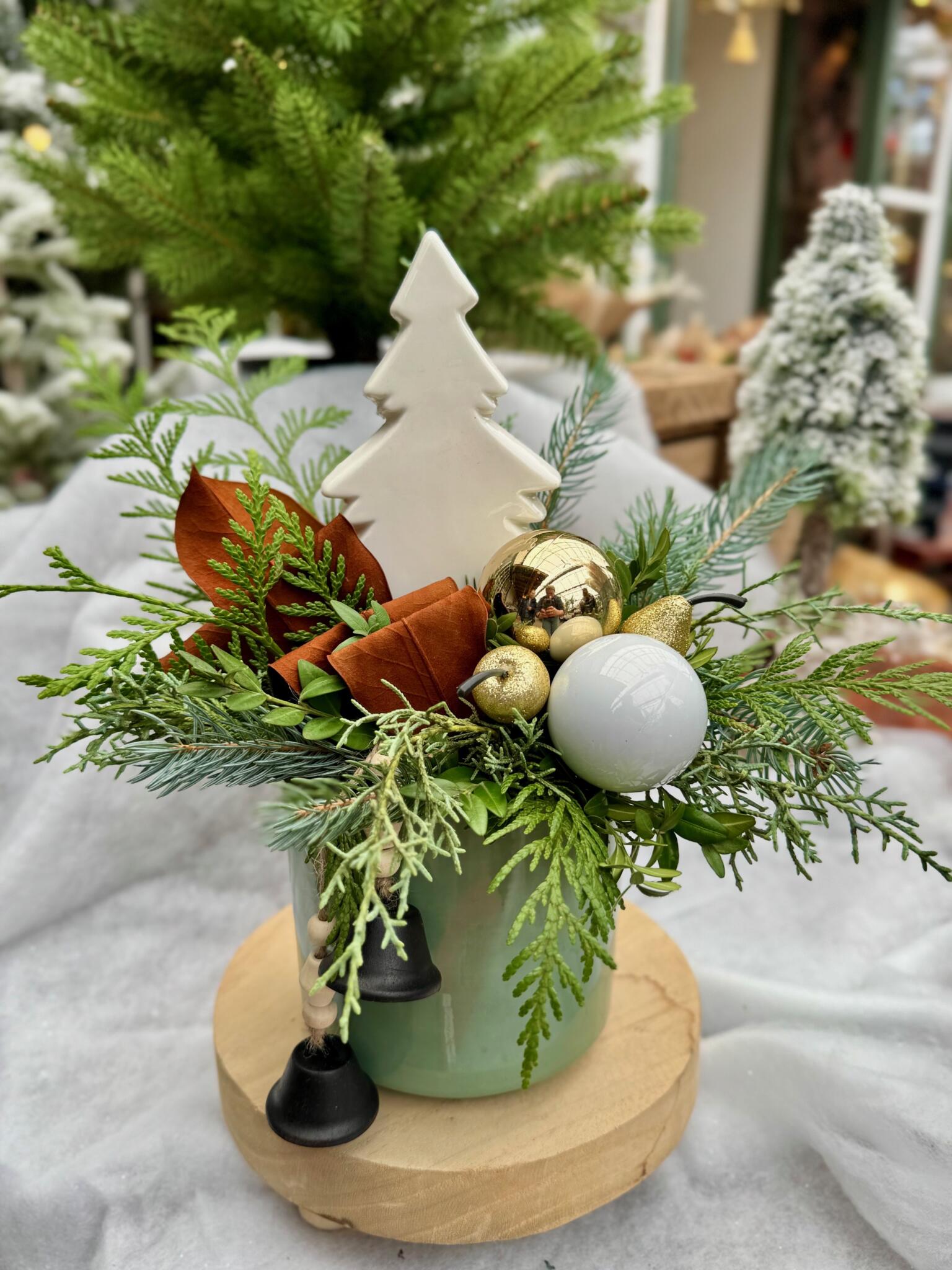 This serene arrangement pairs an ivory ceramic tree with lush seasonal winter greens and delicate ornaments, creating a timeless centerpiece that captures the quiet beauty of the North.