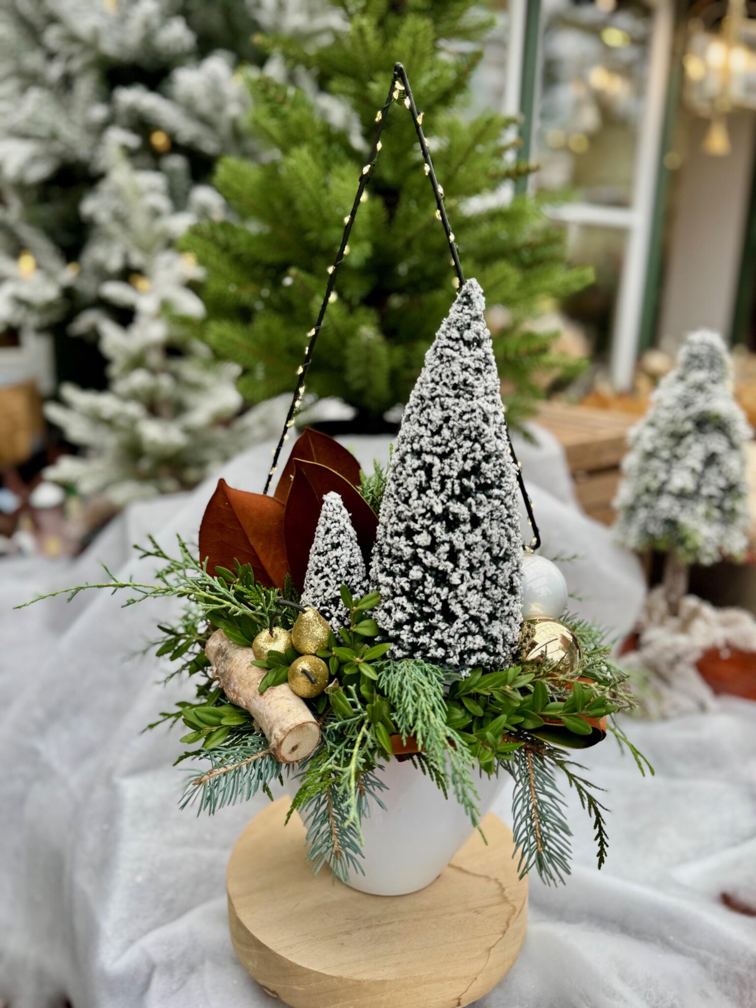 Surrounded by broom trees, winter seasonal greenery, and elegant white and gold accents, it brings a touch of seasonal charm to any room.