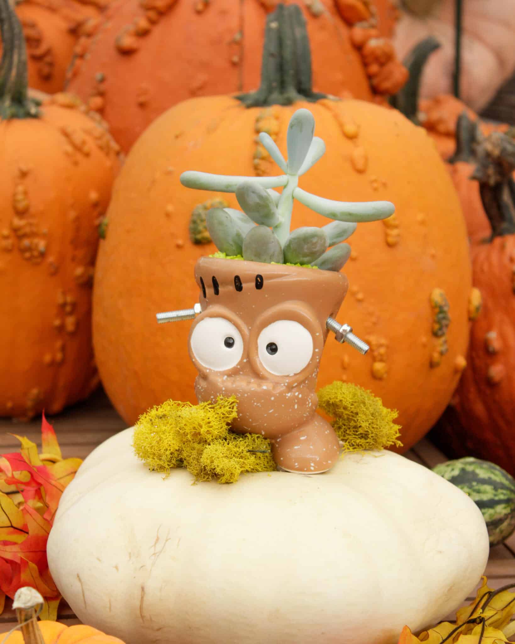 This eerie little experiment pairs a hardy succulent with a Frankenstein Jr. pot, finished with hauntingly lime green stones.