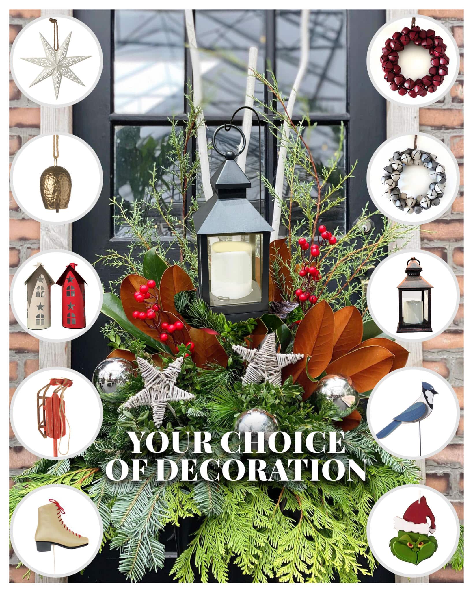 With over 12 different items to choose from, along with an array of dazzling decorations, you'll have the freedom to create a winter masterpiece that perfectly compliments your front entryway.
